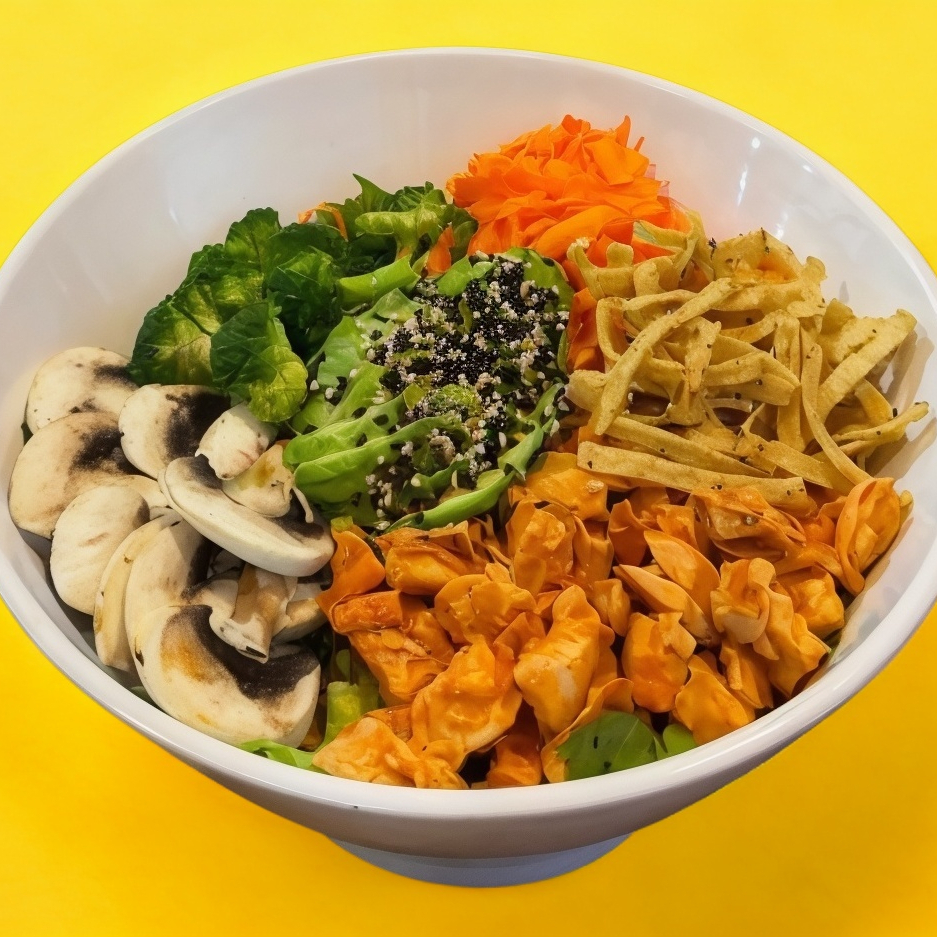 La combinación ideal de frescura y sabor intenso. Base de lechuga orejona con pollo buffalo jugoso, zanahoria, champiñones y aguacate cremoso. 🥑🥕 Acompañada de aderezo ranch y tiras de maíz crocantes. 🥗✨