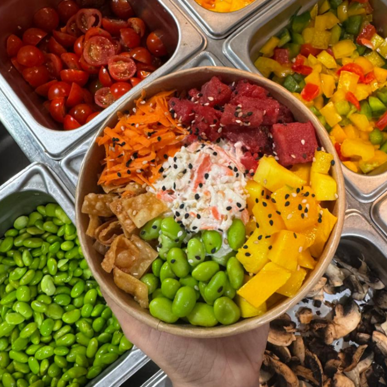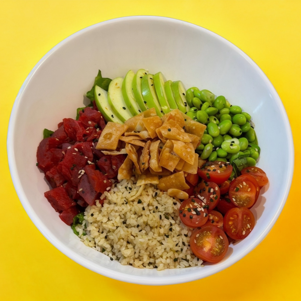Base de arroz suave acompañado de un medallón de atún y tampico cremoso, combinados con mango, edamames, zanahoria. Lo mejor: lo bañamos con aderezos de chipotle y anguila para un toque único, y finalizamos con crujientes tiras de wonton. 🥢🔥 Una experiencia fresca, nutritiva y deliciosa en cada bocado. 🥗💛