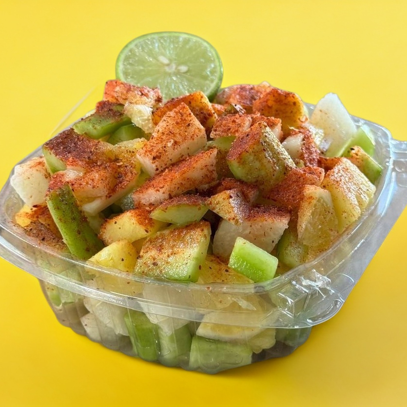 Piña, jícama, pepino, naranja, con tajin y limón.