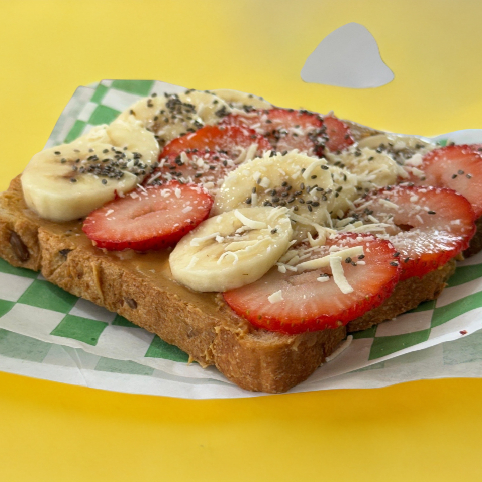 Pan integral tostado con crema de cacahuate, plátano, fresa (por temporada).