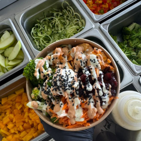 Un bowl con el balance perfecto entre lo fresco y lo crujiente. Base de arroz suave con jugoso pollo estilo buffalo, acompañado de brócoli al vapor, zanahoria fresca, arándanos dulces y un toque cremoso de queso Philadelphia. Para coronar, la mezcla ideal de aderezos chipotle y ranch, más crutones doraditos que le dan el crunch irresistible. 🥗✨