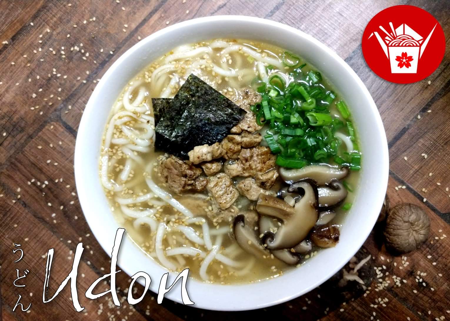 Sopa de fideo grueso 300gr en consomé de dashi y pollo, servido con cebollín, hongo shitake, ajonjolí y carne de puerco a la plancha.