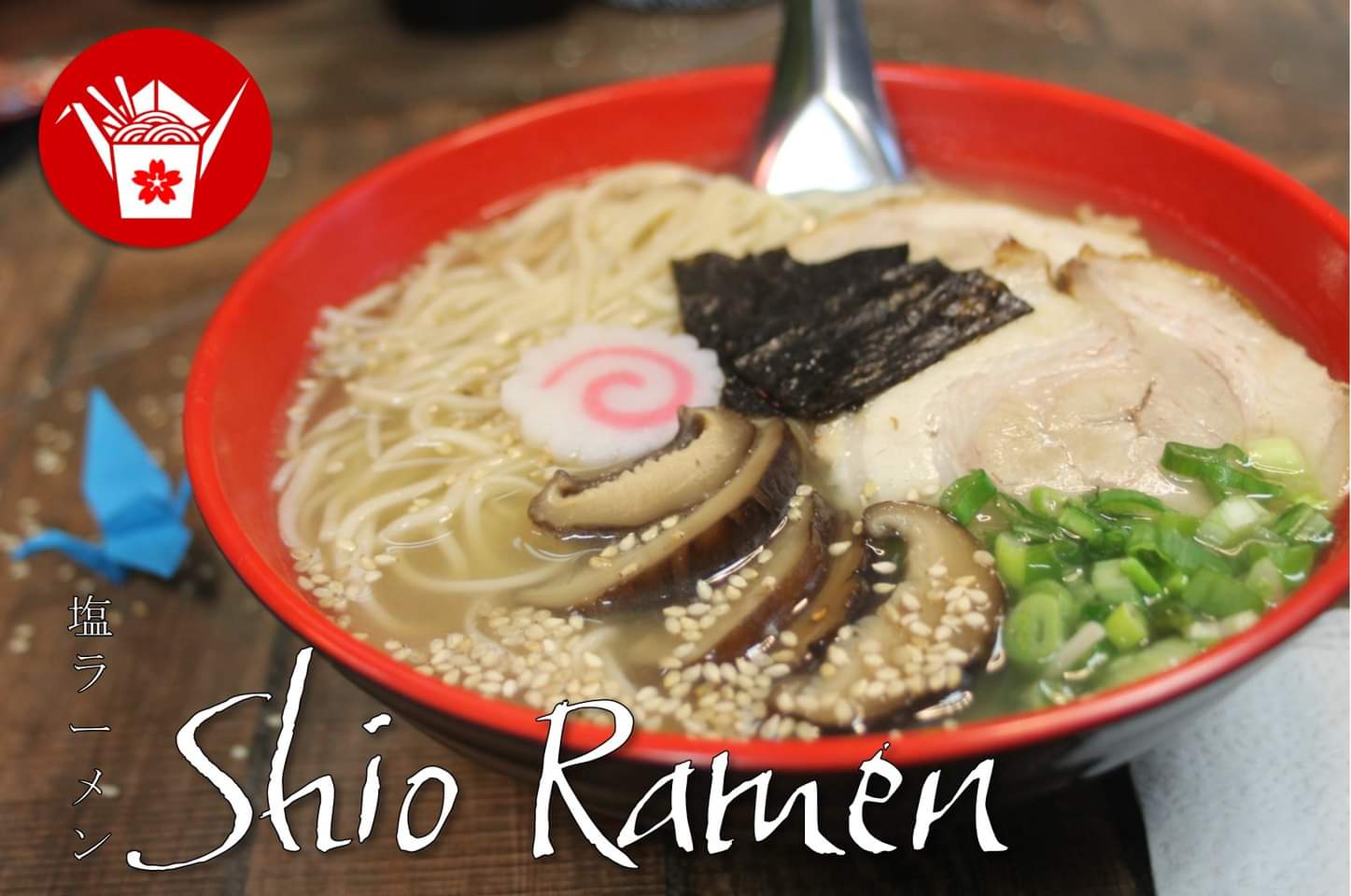 Sencillo y tradicional, caldo a base de pollo y shio tare, con fideo delgado, naruto, hongo shitake, ajonjolí, cebollín alga y 30 grms de chashu.