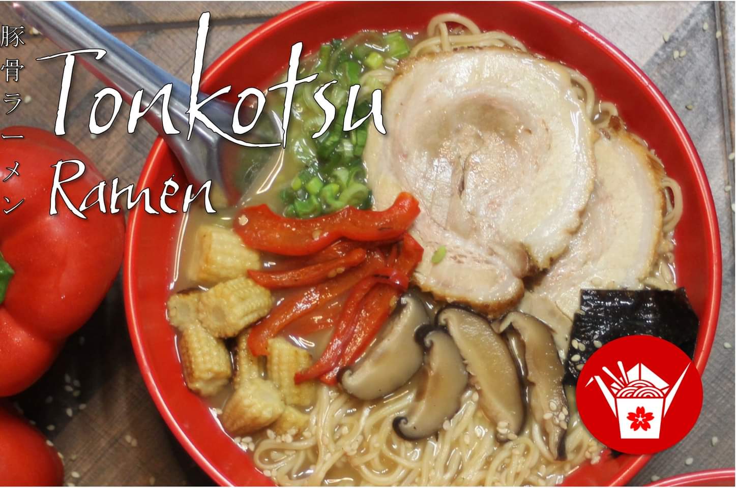 Ramen de la casa, caldo a base de puerco y miso tare, fideo delgado, alga, ajonjolí, cebollín y 60 grms de chashu con un topping a escoger, elotito, chile/pimiento salteado, hongo shitake, huevo.