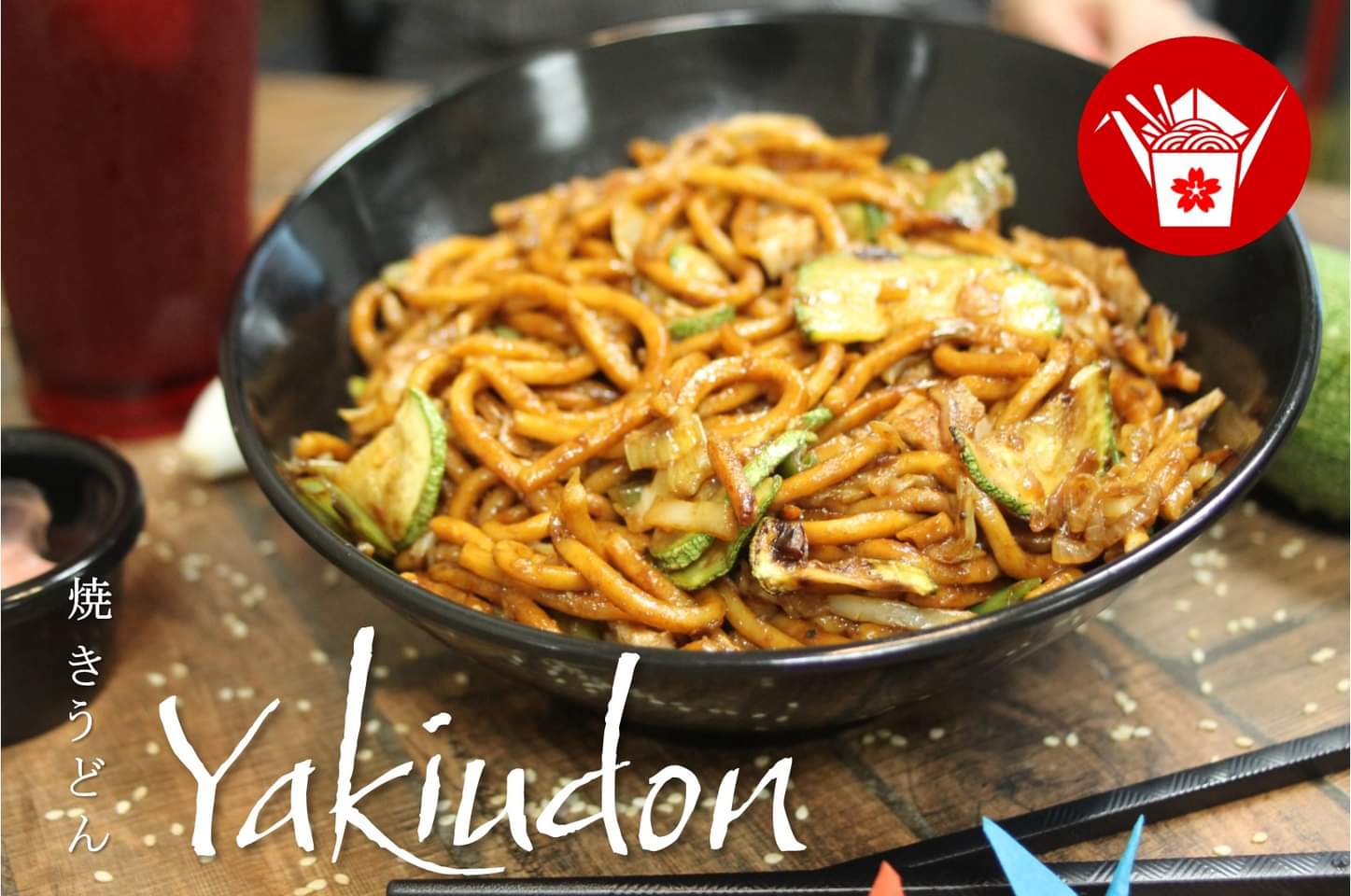 Fideo grueso 400g con carne de puerco ó pollo y verduras, calabaza, repollo, zanahoria y cebollín, salteado con salsa teppanyaki de la casa y especias.