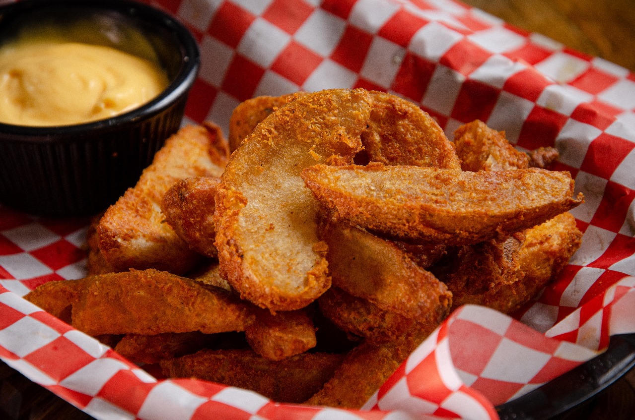 Crujiente y Delicioso Sabor de anillos de Cebolla Acompañado de una Porción de aderezo Ranch