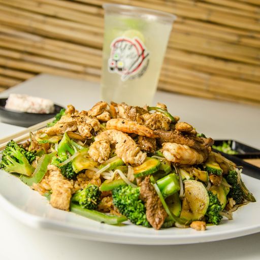 Arroz Mezclado con Serrano. Por dentro: Phila, Aguacate, Pepino, Chile Caribe, Camaron y Pollo