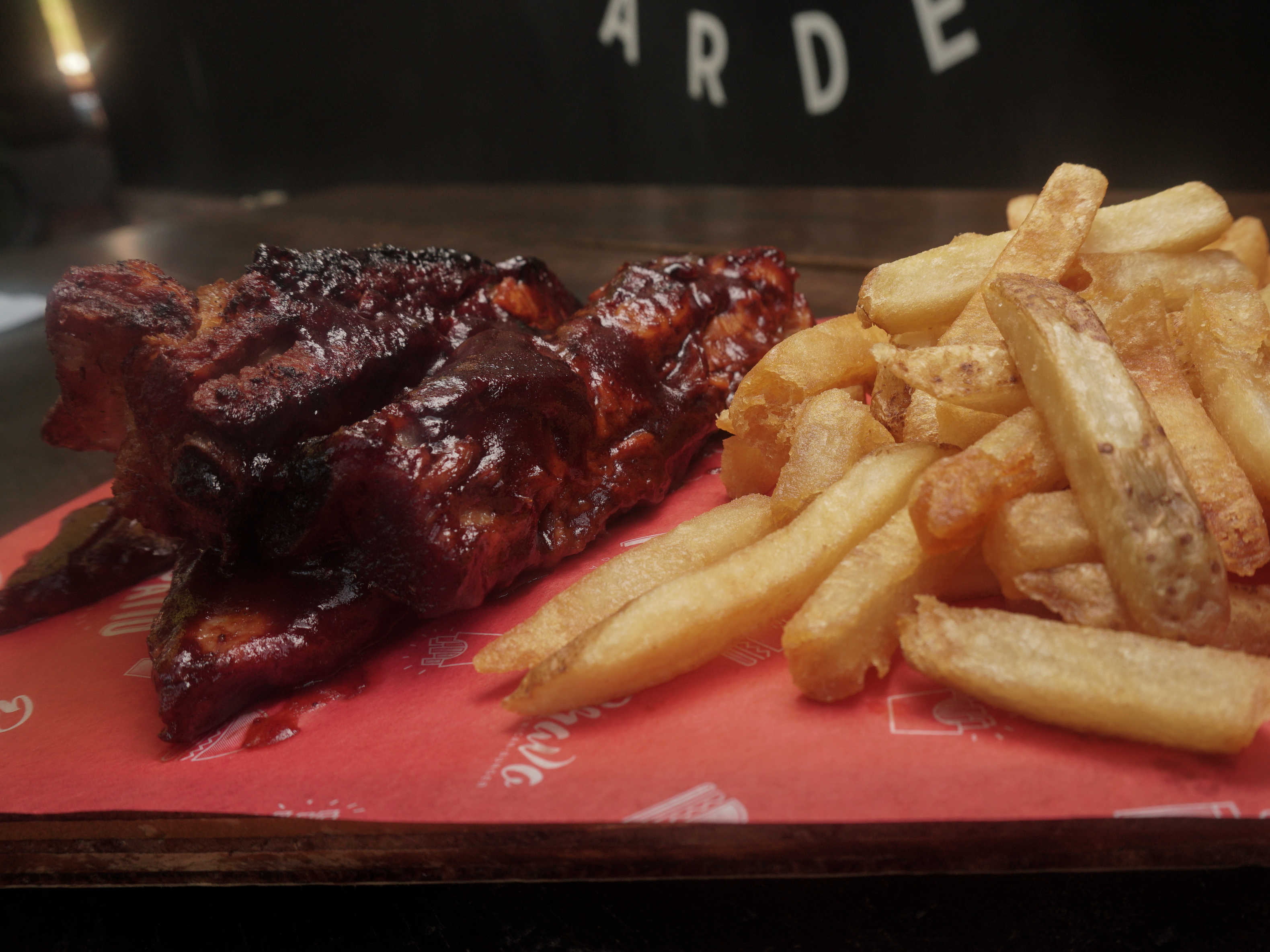 Costillas de puerco horneadas al horno de leña bañadas en bbq.