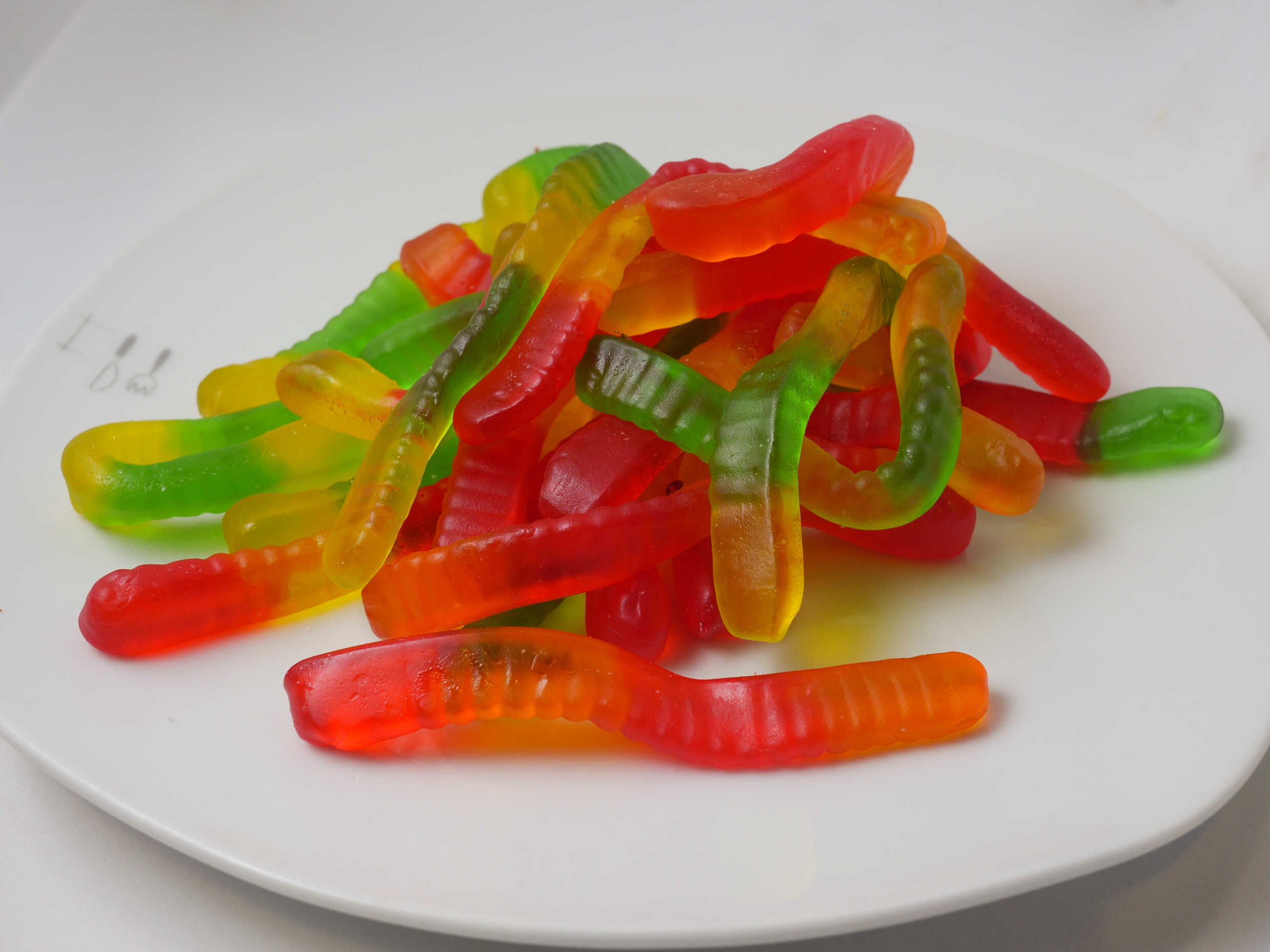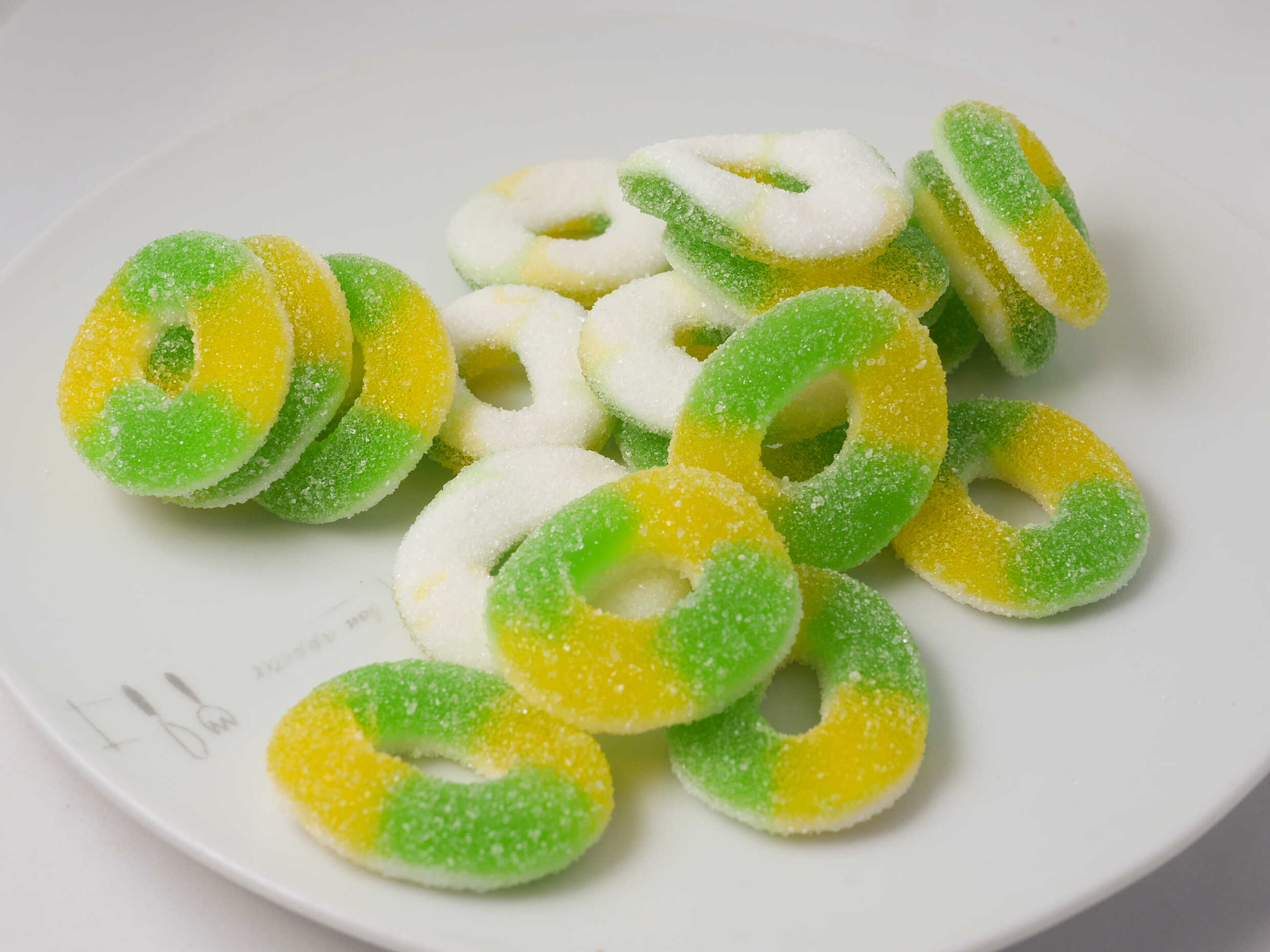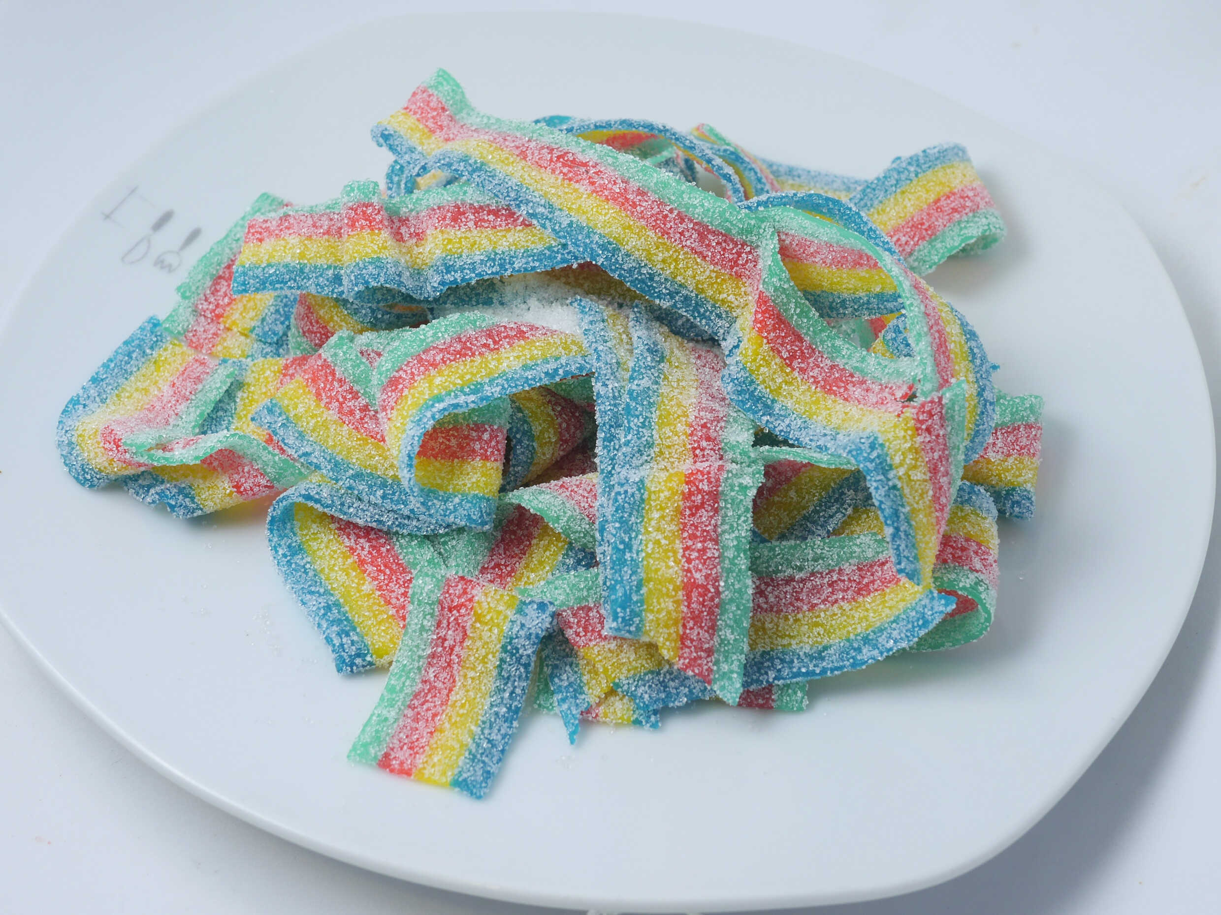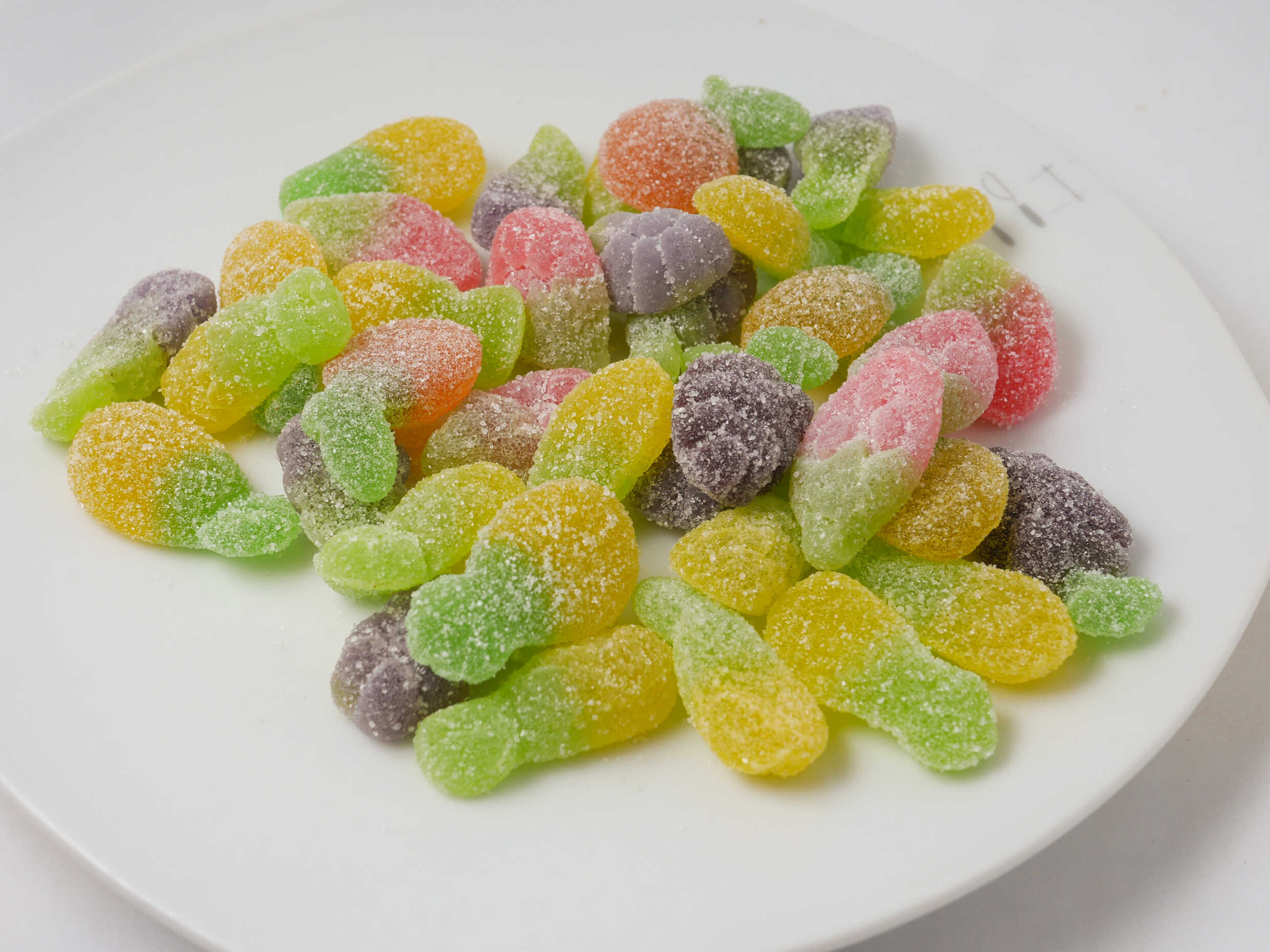 Gomita de frutas en forma y sabor de frutas agridulce.