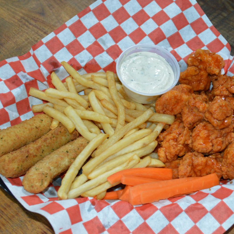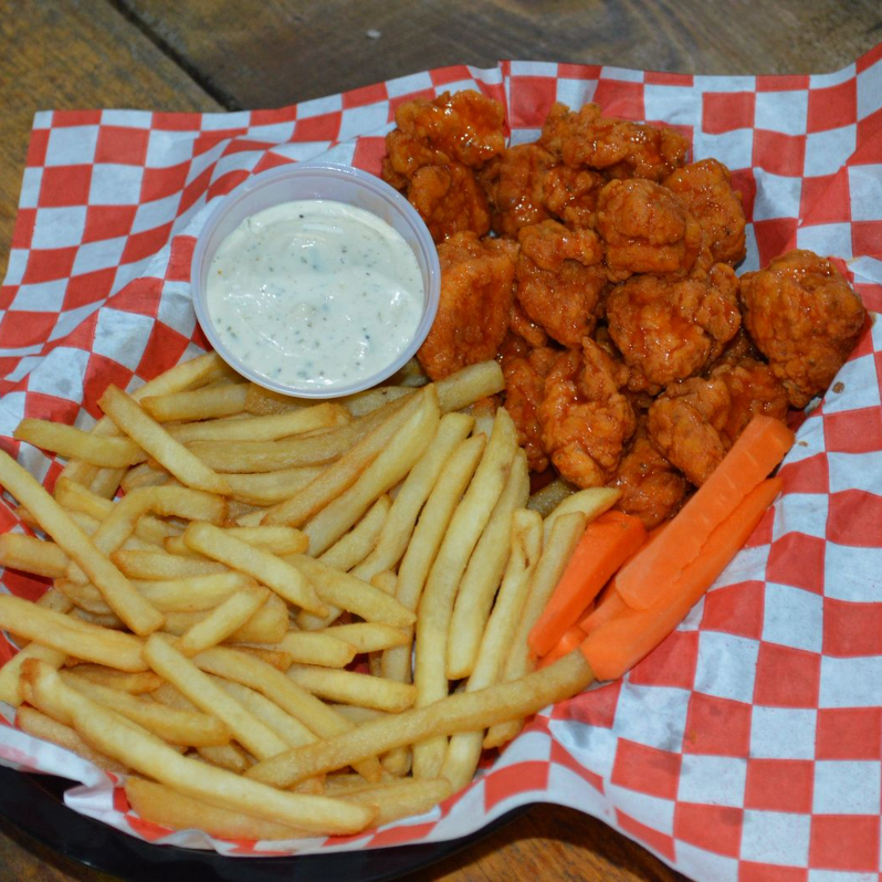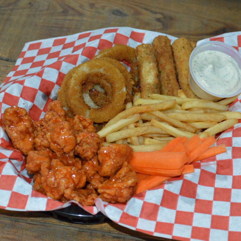 150g de boneless bañados en tu salsa favorita + tres dedos de queso ó 4 aros de cebolla + porcion de papas, zanahoria y ranch.