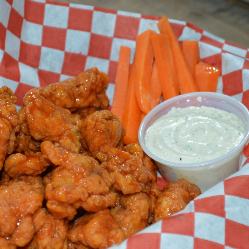250g de boneless bañados en tu salsa favorita, acompañado de ranch y zanahoria