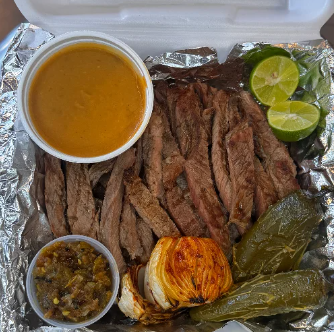 500 g De carne asada, frijoles puercos, tortillas de maíz, salsa y ensalada.