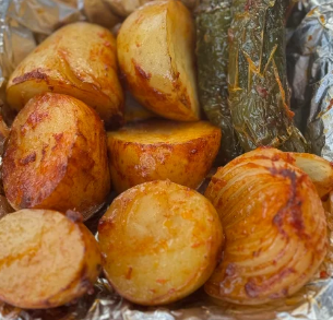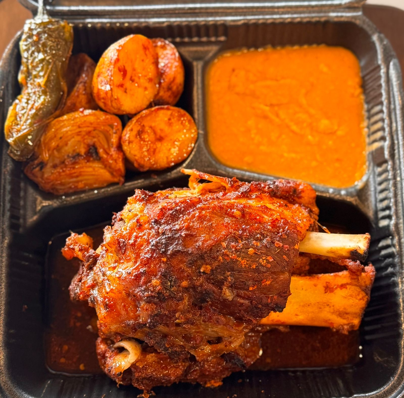 Chamorro de cerdo adobado al horno acompañado de papas, cebolla, chiles y salsa.