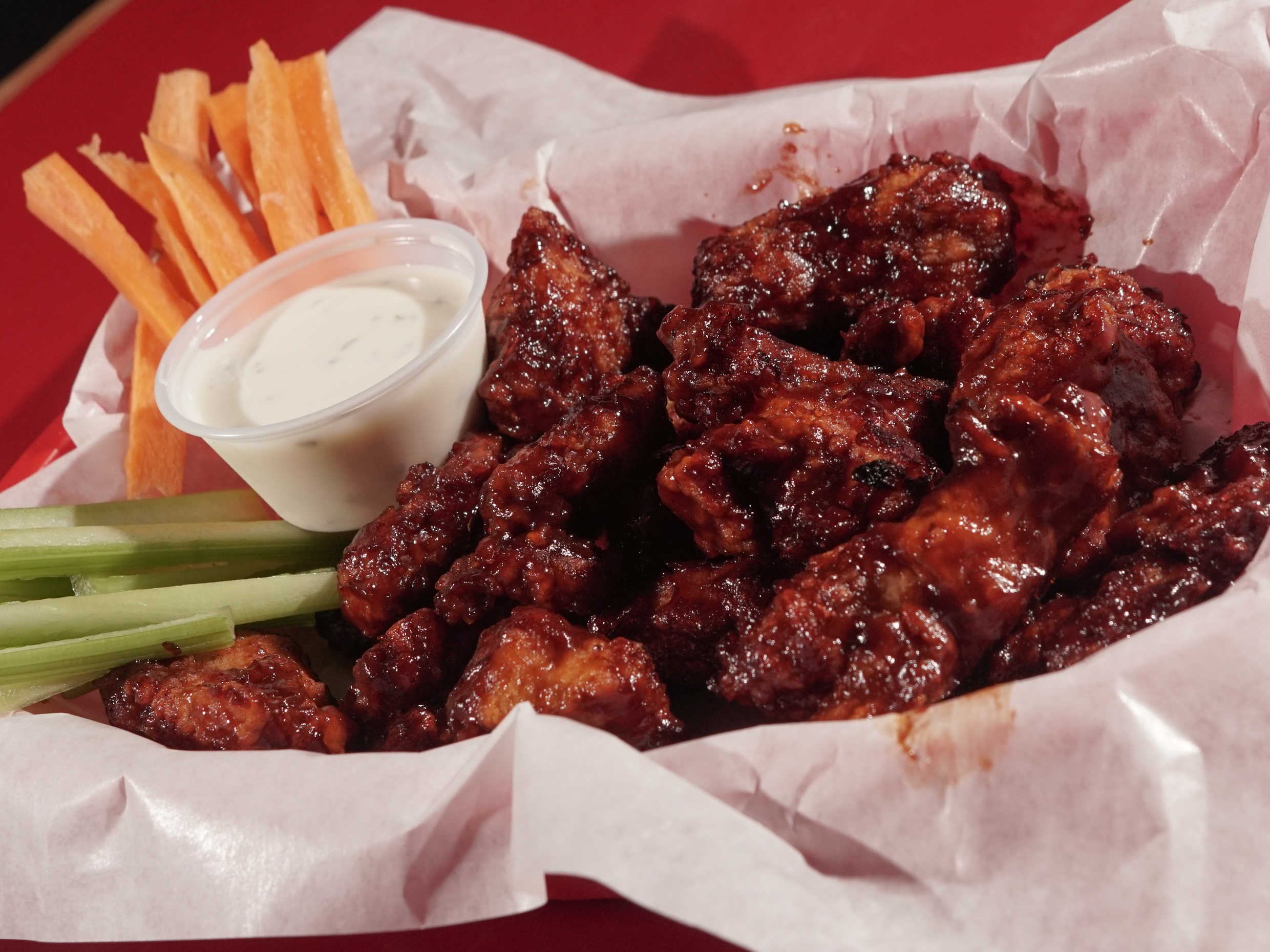 300 grs. de tiras de pollo empanizadas y bañadas en salsa de su elección, acompañadas de zanahoria, apio y aderezo Ranch.