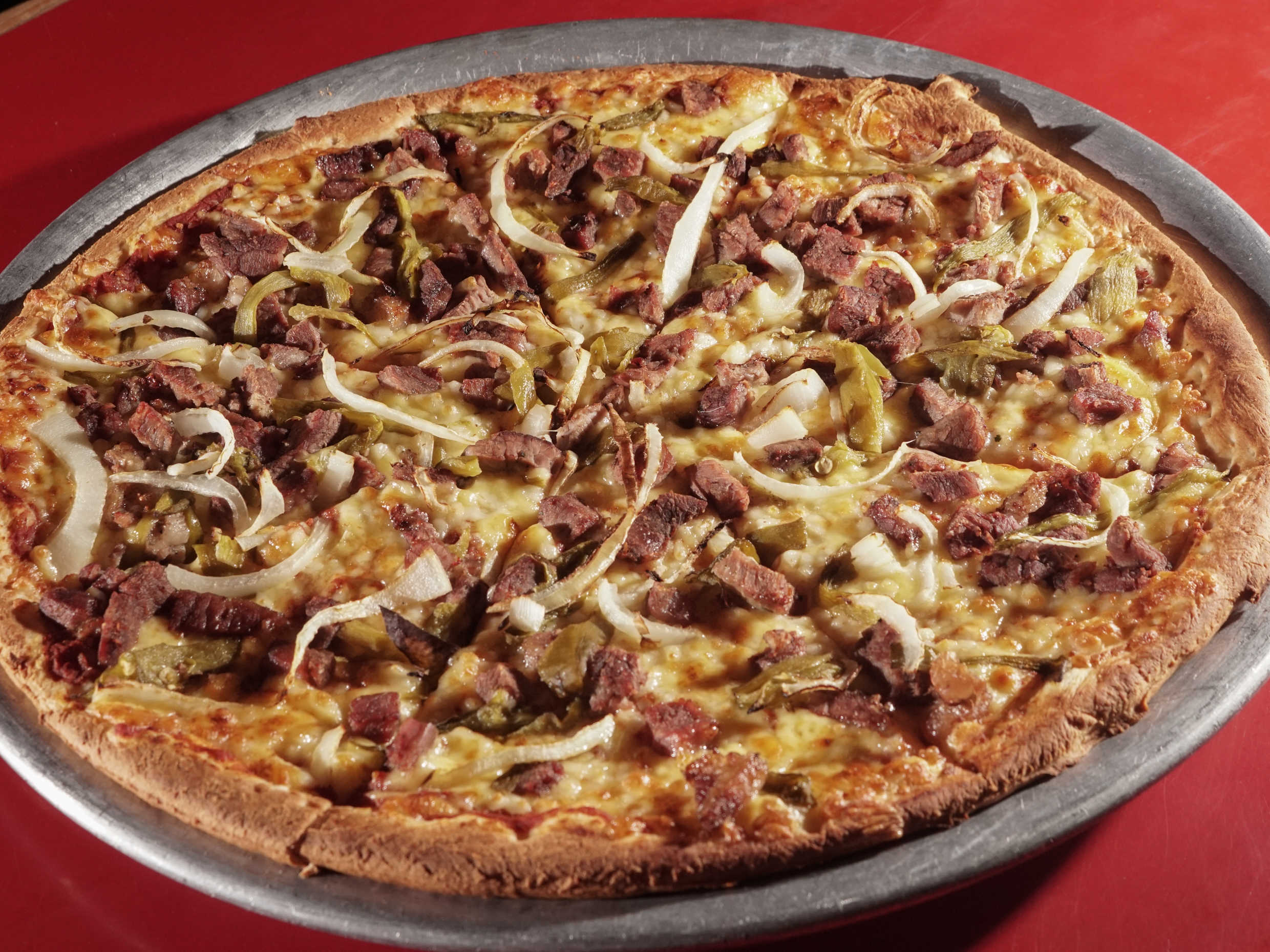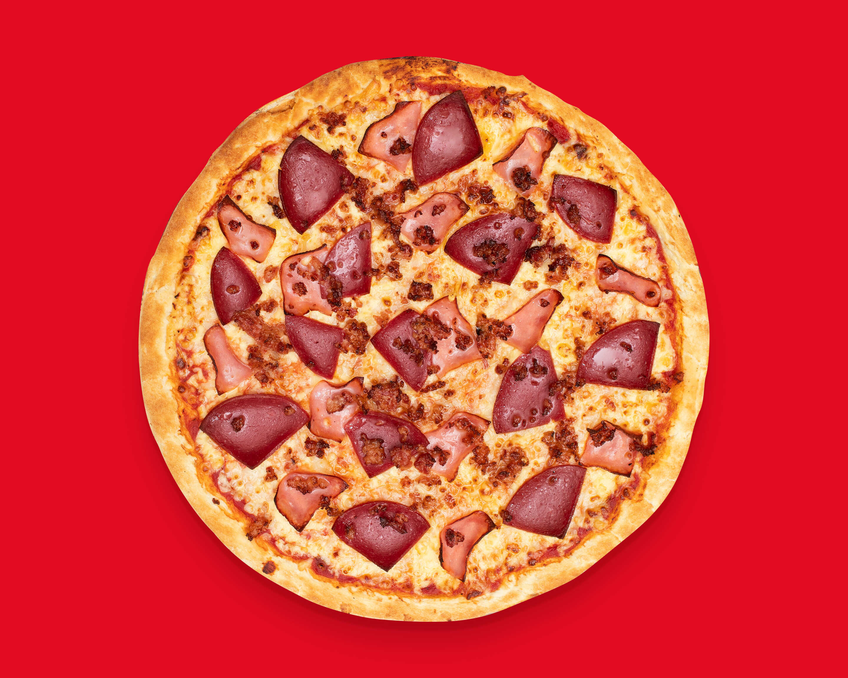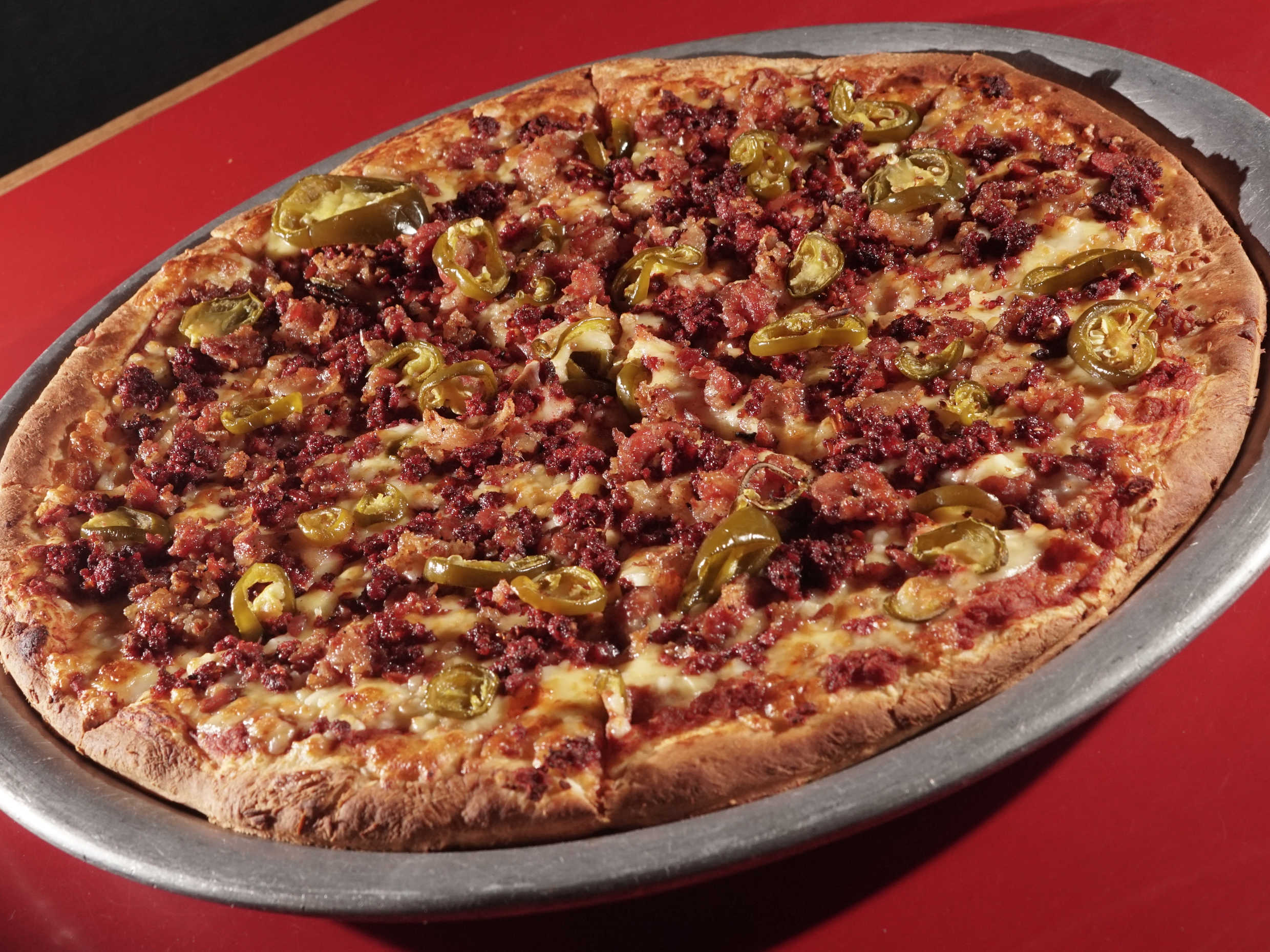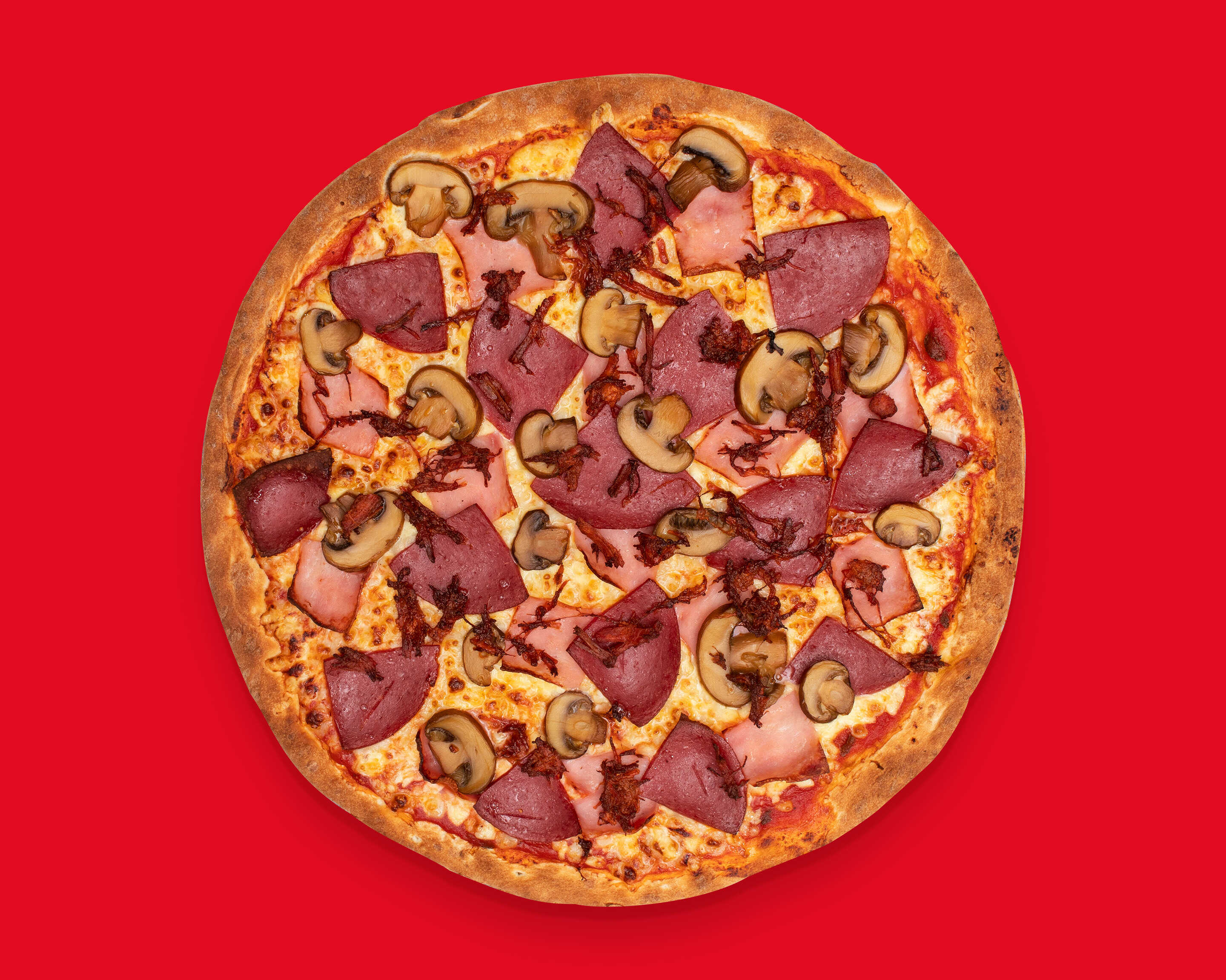 Salami, champiñones, pimiento verde, ostión ahumado y queso extra