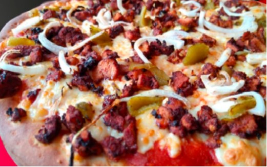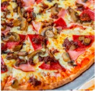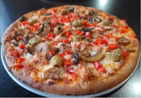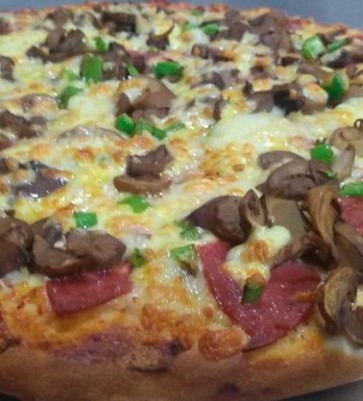 Salami, champiñones, pimiento verde, ostión ahumado y queso extra