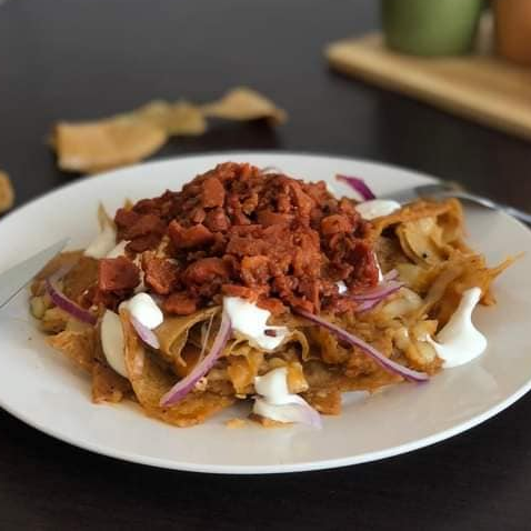 Chilaquiles en salsa con queso gratinado acompañado con cebolla, crema y coronado con Discada Preparada.