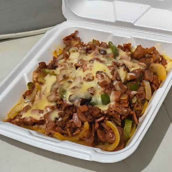 Papas fritas con queso gratinado y coronadas con Discada Preparada adornado con crema.