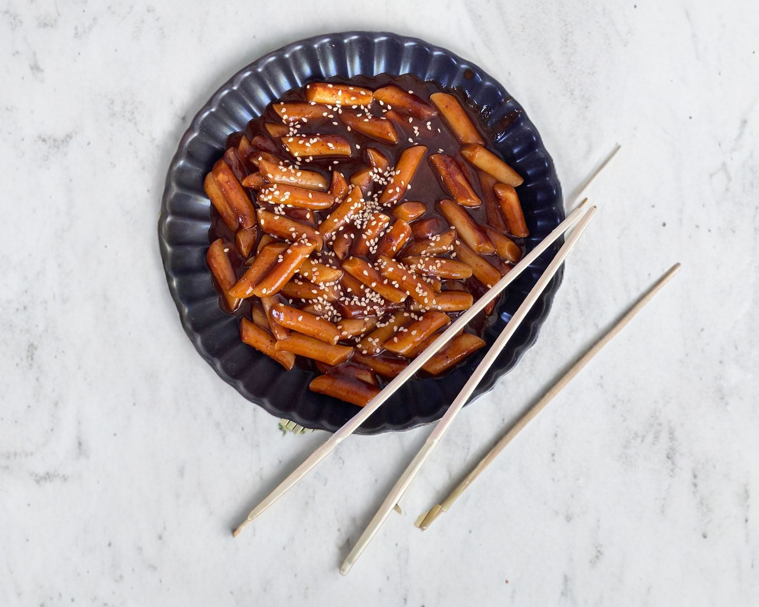 platillo tradicional coreano a base de pasta de arroz en salsas coreneanas