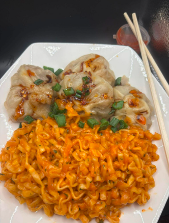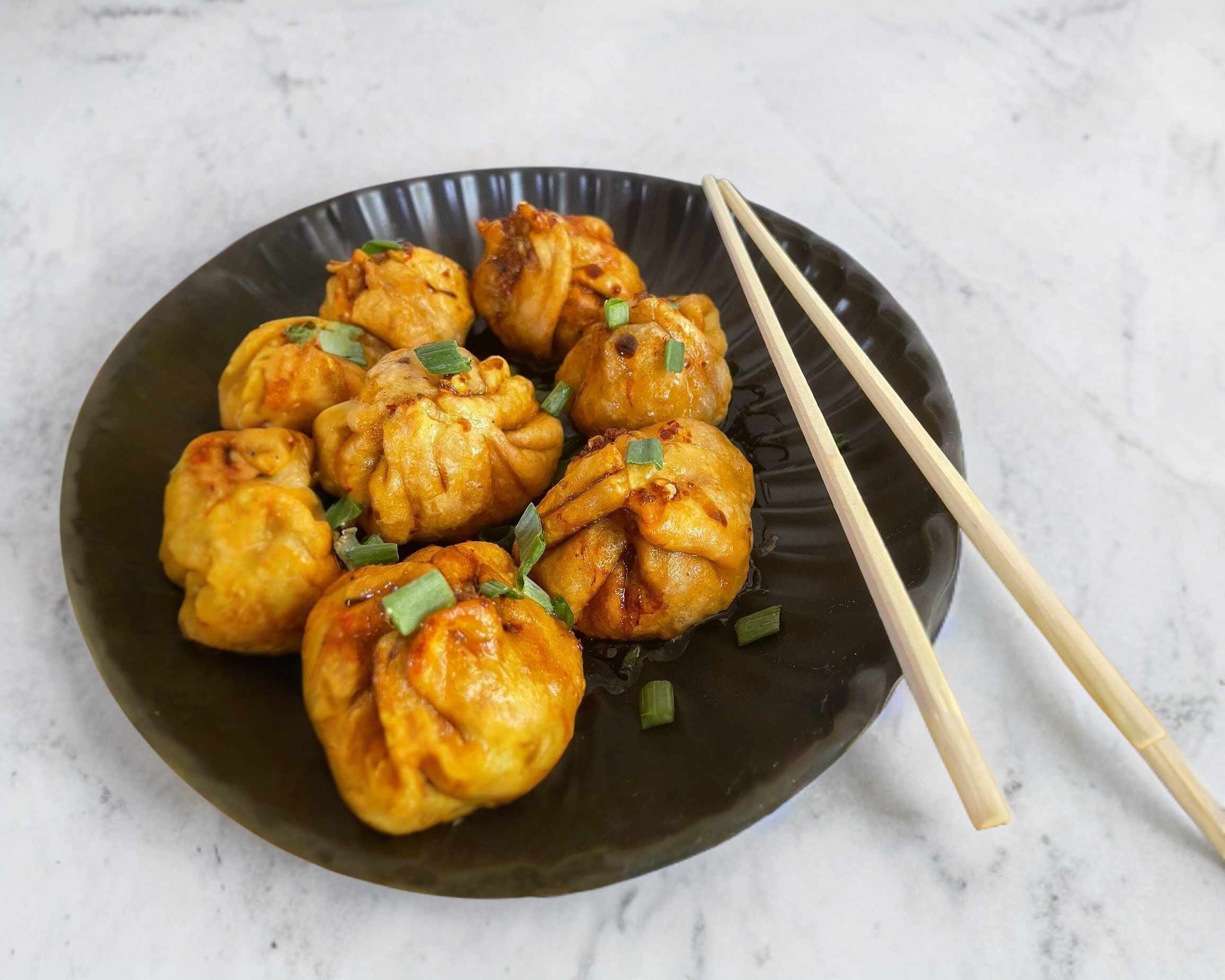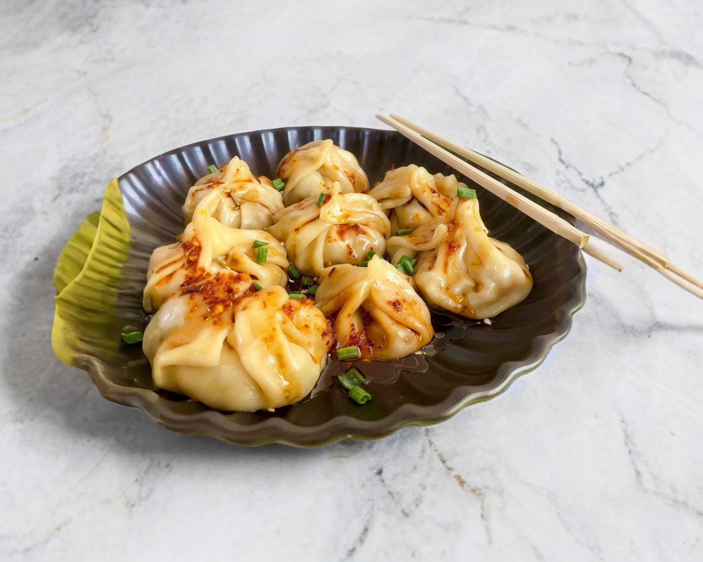4 Dumplings al vapor y 4 fritos rellenos de carne molida de cerdo preparado estilo coreano incluye salsa macha cebollin y soya