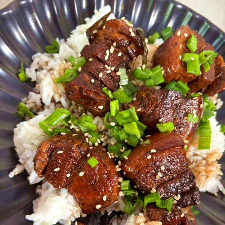 200 g de panceta de cerdo sobre una cama de arroz con ajonjoli tostado y cebollin