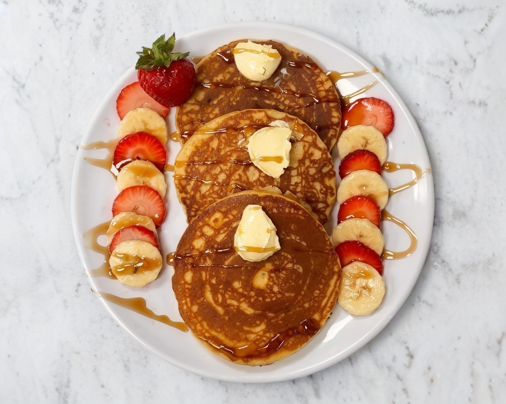Orden de 3 hotcakes acompañados de mantequilla, miel, plátano y fruta de temporada, incluye café