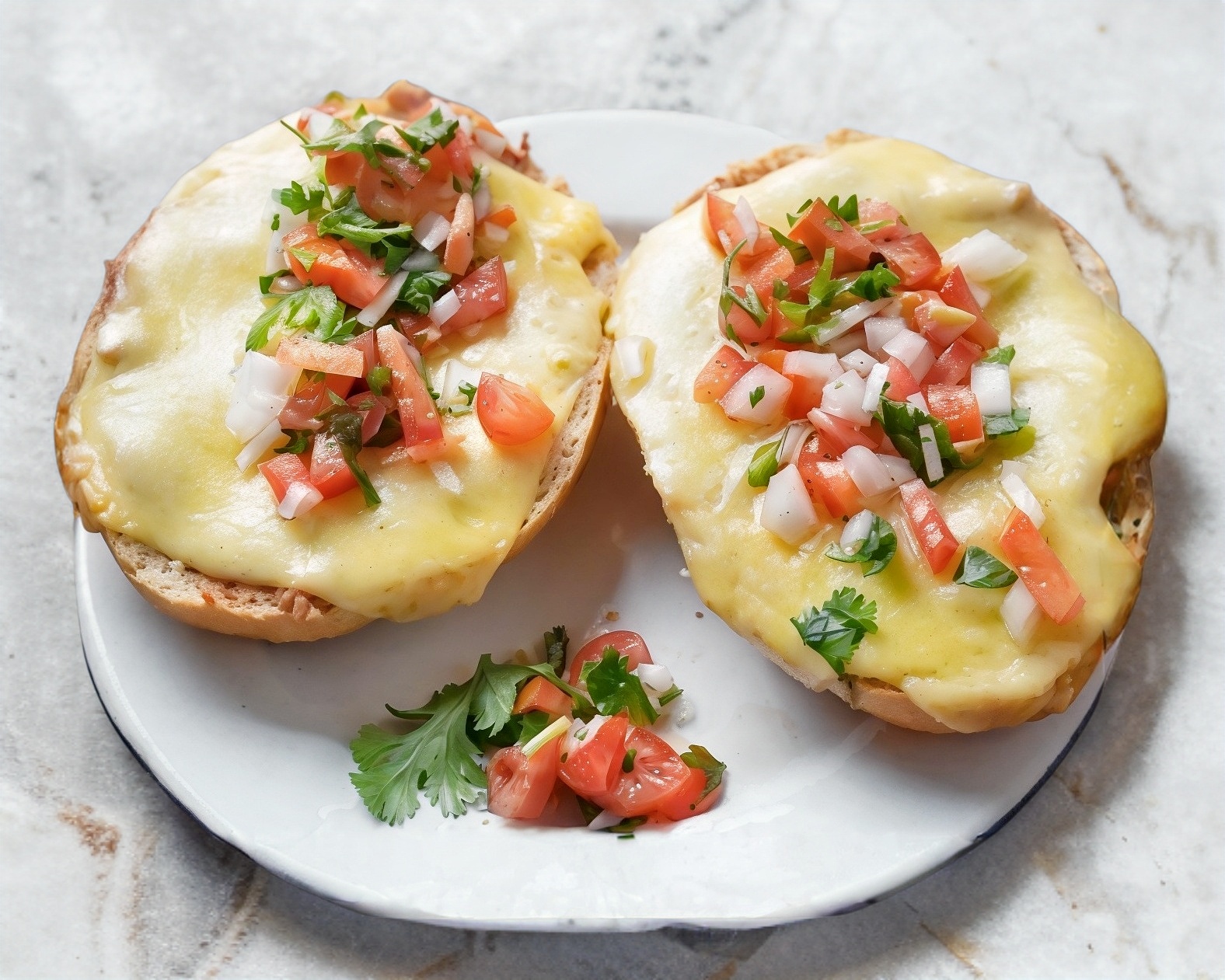 2 Molletes de frijol con queso acompañados de salsa bandera, incluyen café