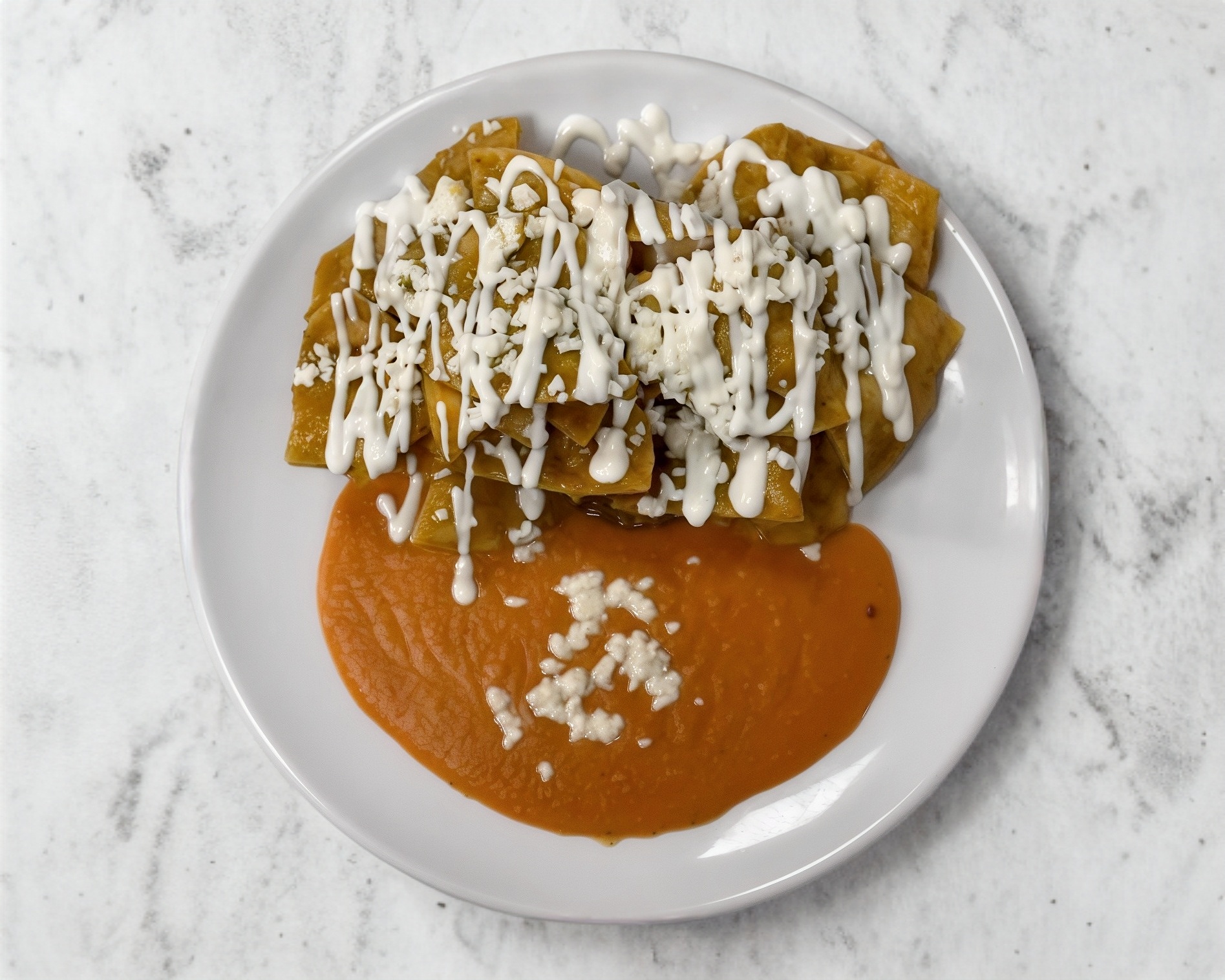 Orden de chilaquiles con crema y queso acompañados de frijoles puercos, el platillo incluye café