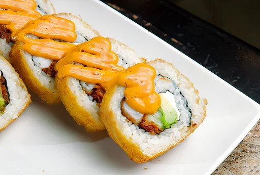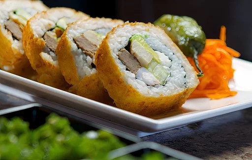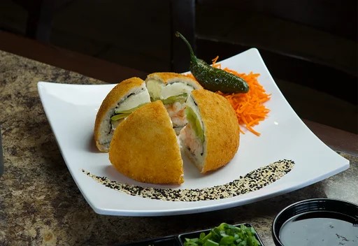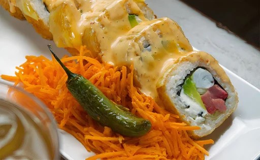 Pepino, aguacate, queso phila, camarón, marlín, chile toreado y por fuera queso manchego gratinado bañado con aderezo dinámico.