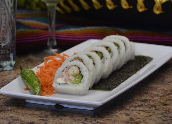 Pepino, aguacate, queso phila, chile serrano, camarón empanizado y tampico.
