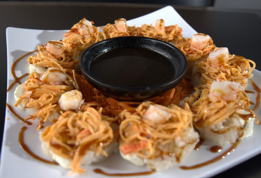 Rollo relleno de salmón empanizado, aguacate, pepino y doble porción de phila. Por fuera coronado con kanikama y camarón más un toque de nuestra salsa de la casa.