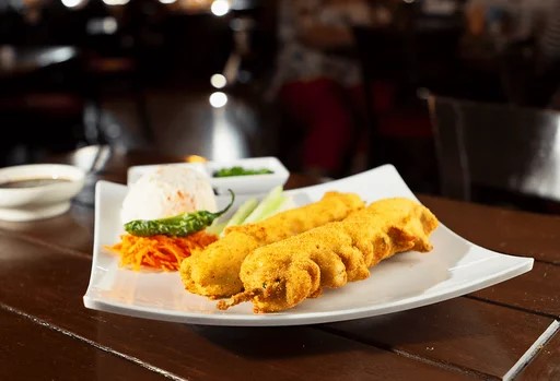 Camarones con phila 3 pz, deditos de queso manchego o phila 3 pz, chile relleno 1 pz y cebollitas capeadas.