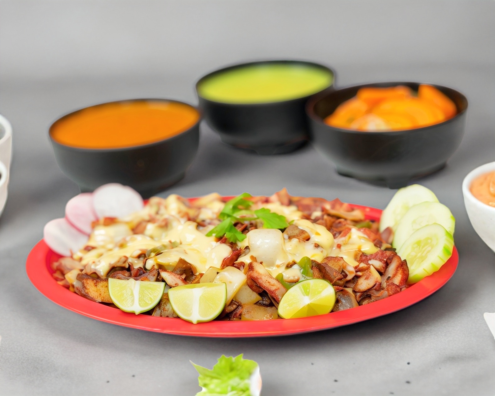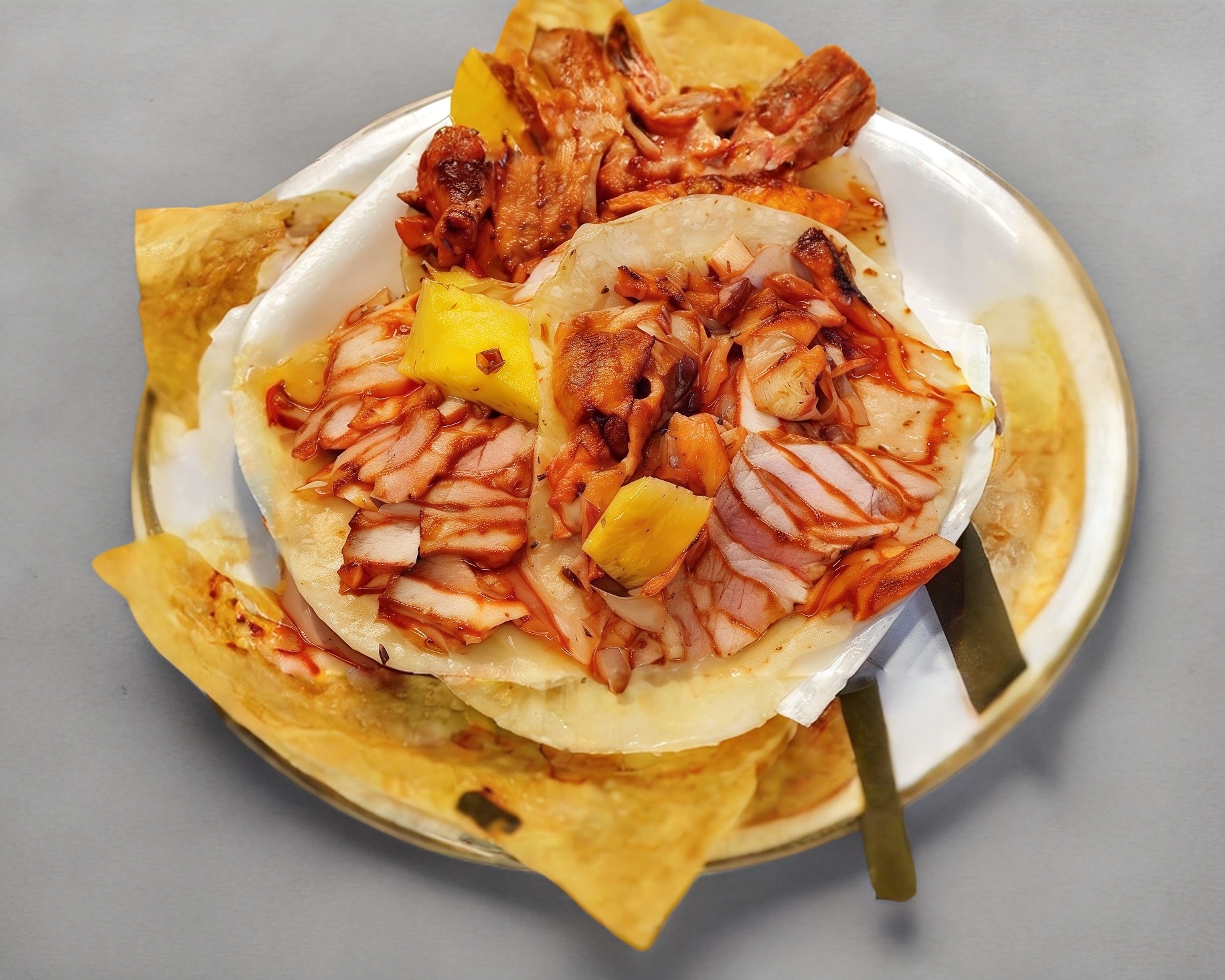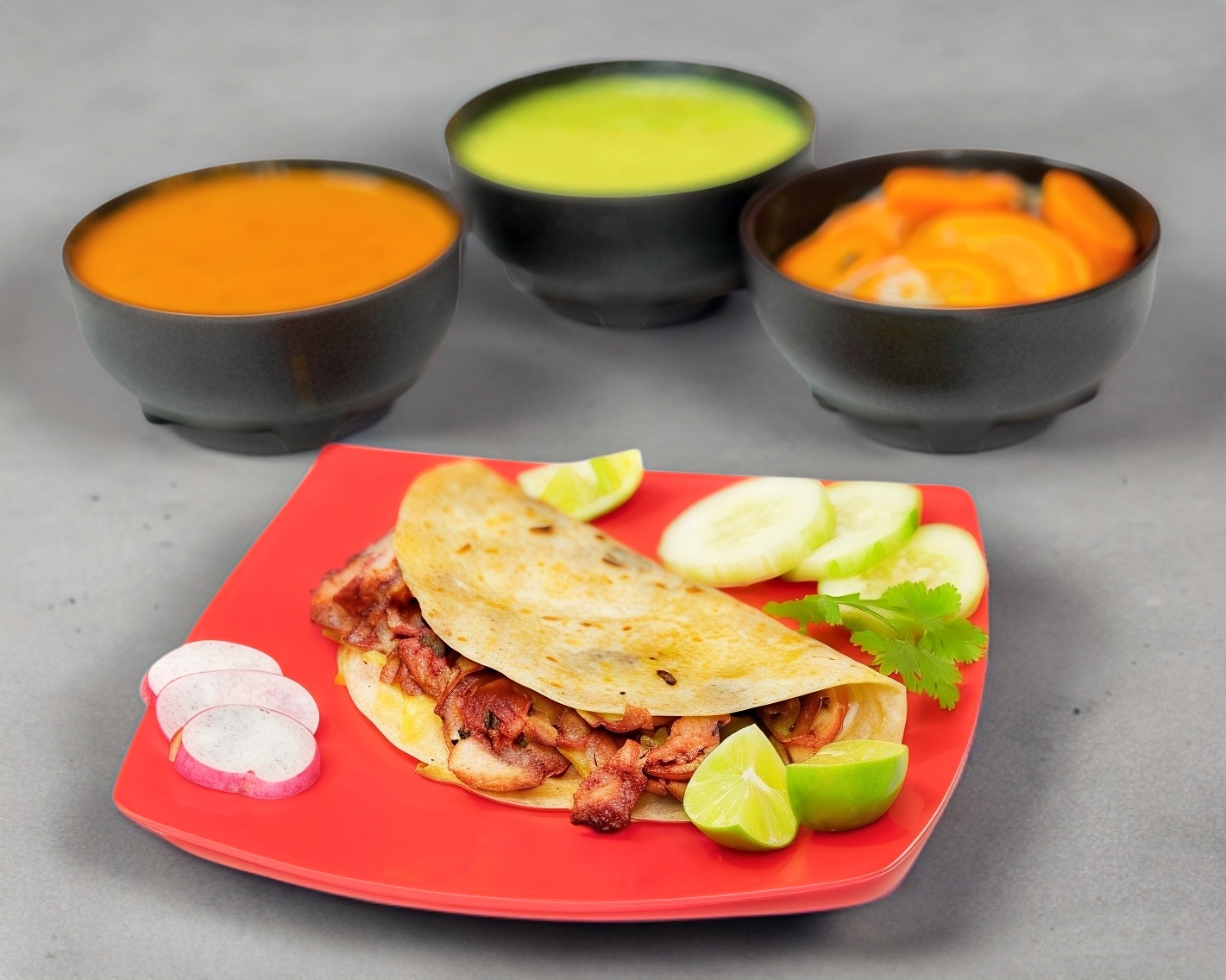 Morrón, cebolla, tocino, chorizo, pastor y queso gratinado. 1/2 Orden.