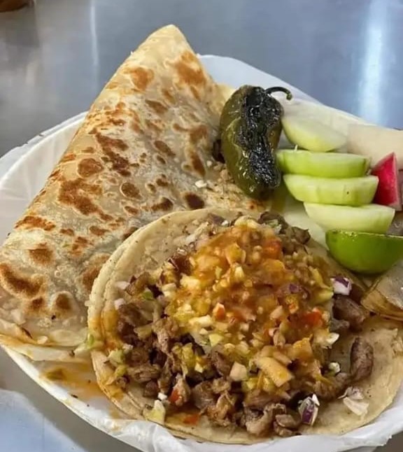 Tortilla de maíz rellena de carne asada con repollo, jugo de Tomate y verduras aparte.