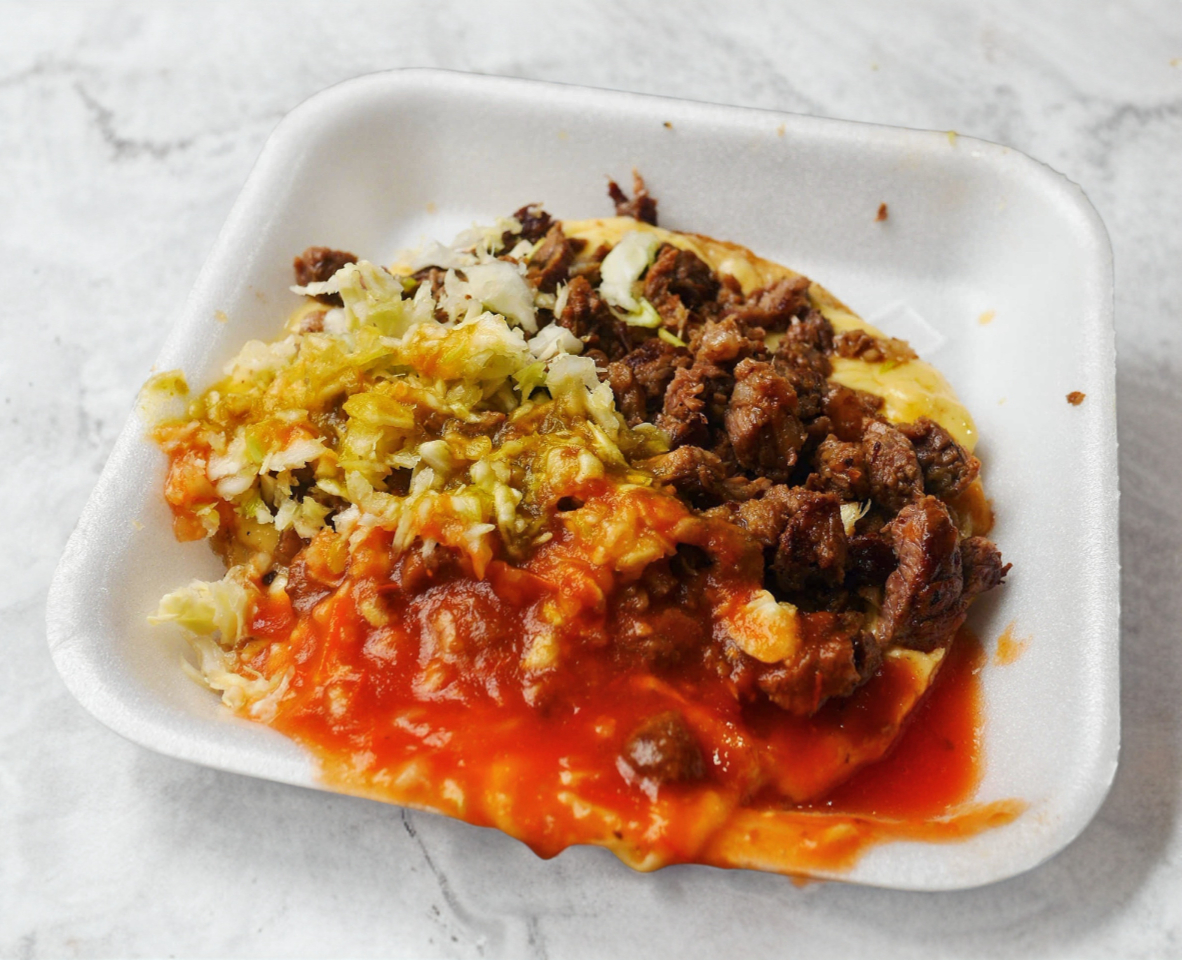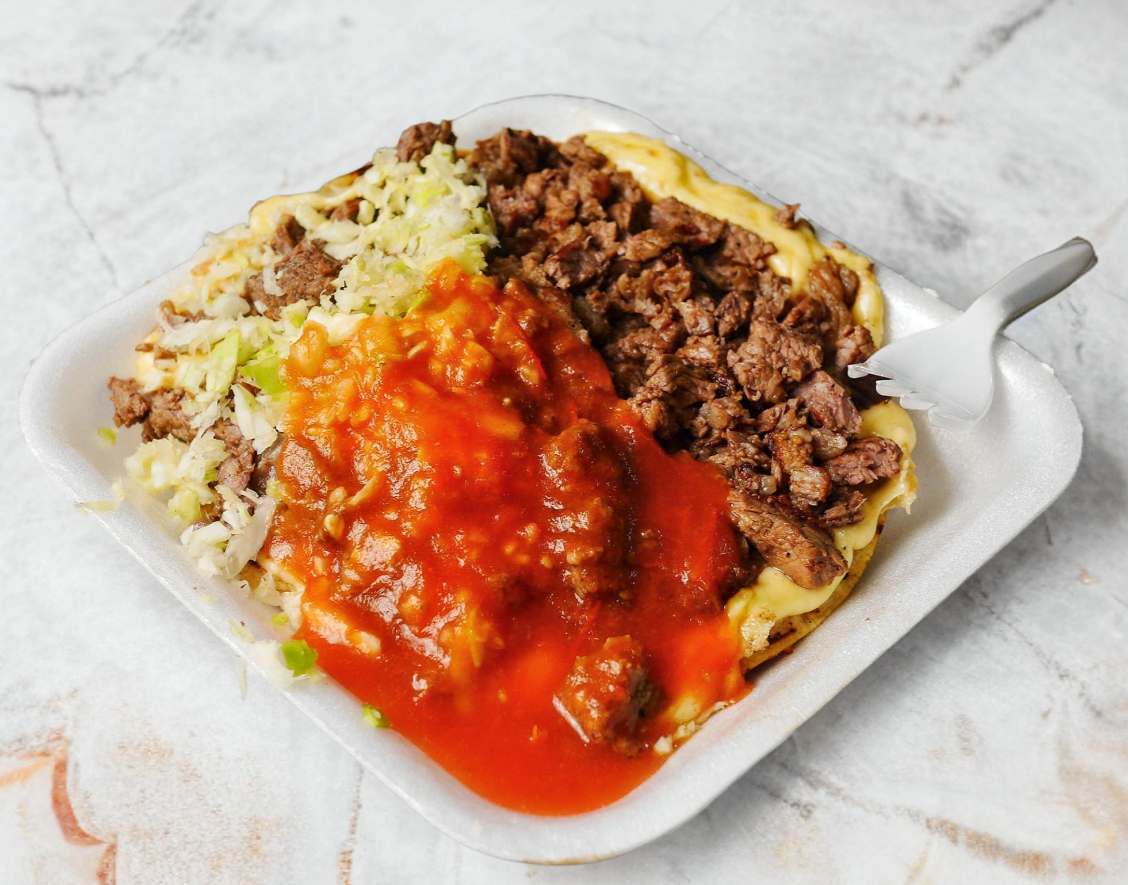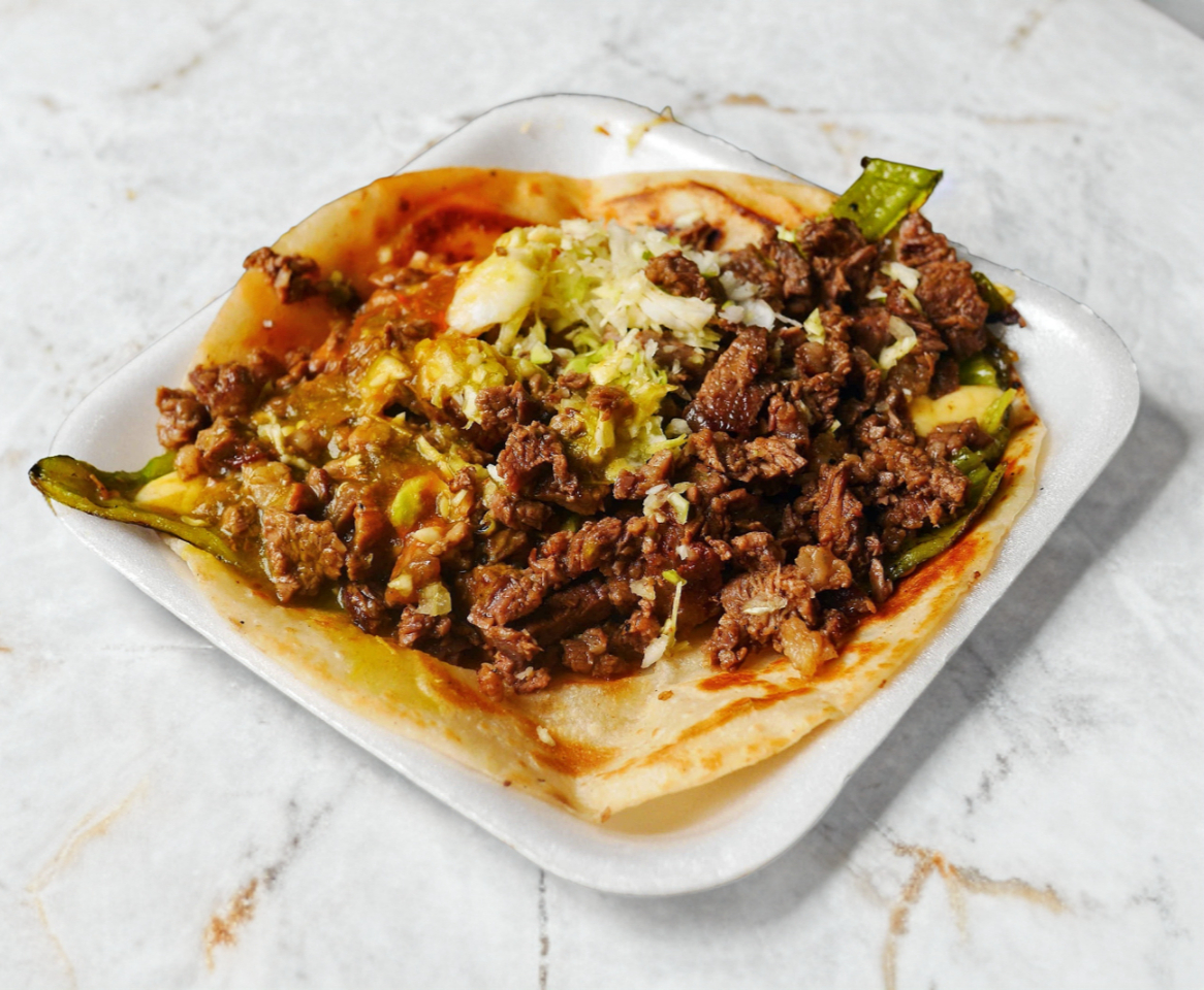 Carne, mantequilla, papa y queso mas tocino, tortilla a escoger entre harina, maíz o dorada.