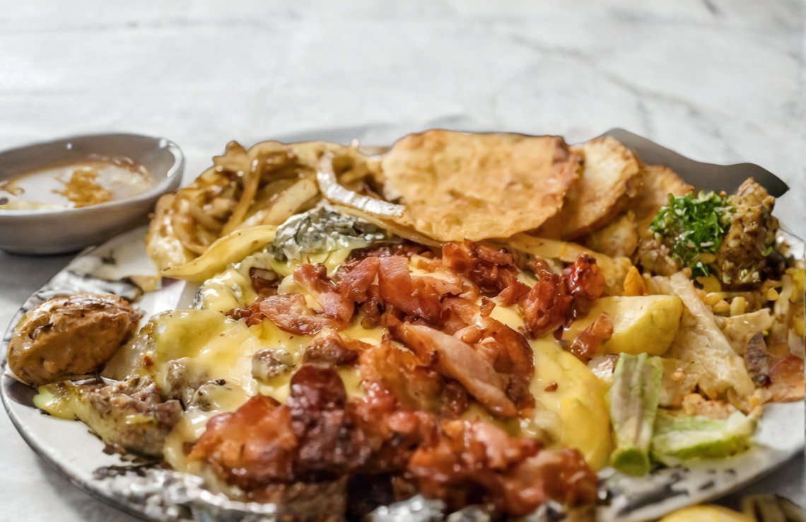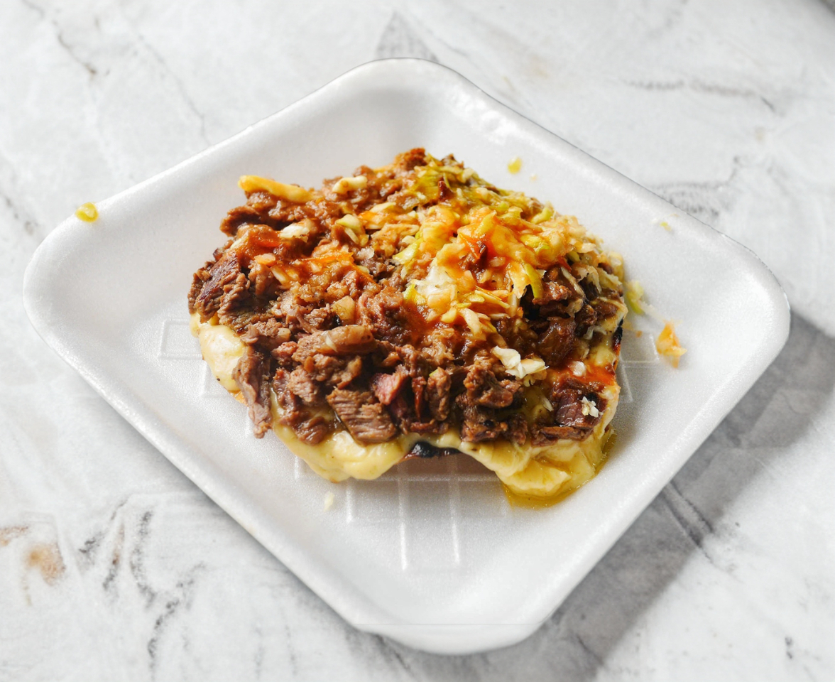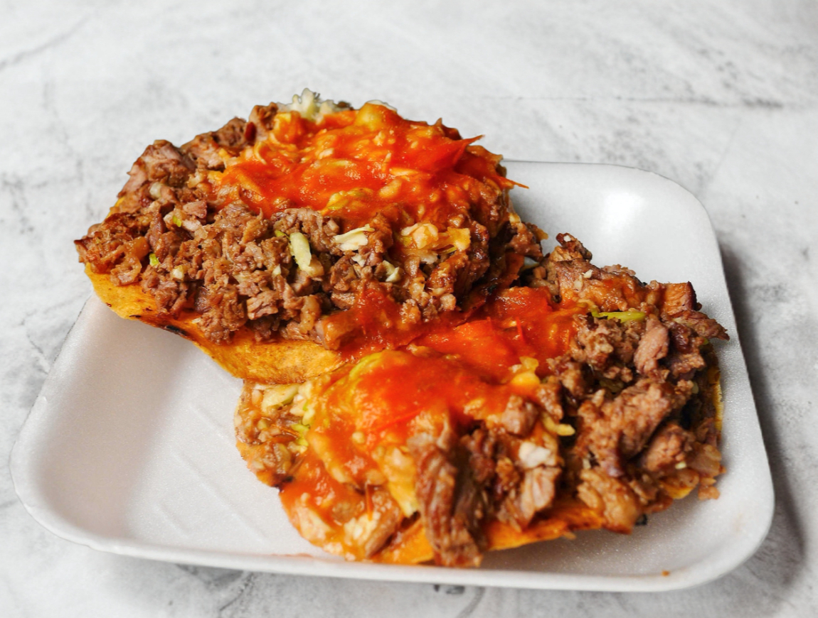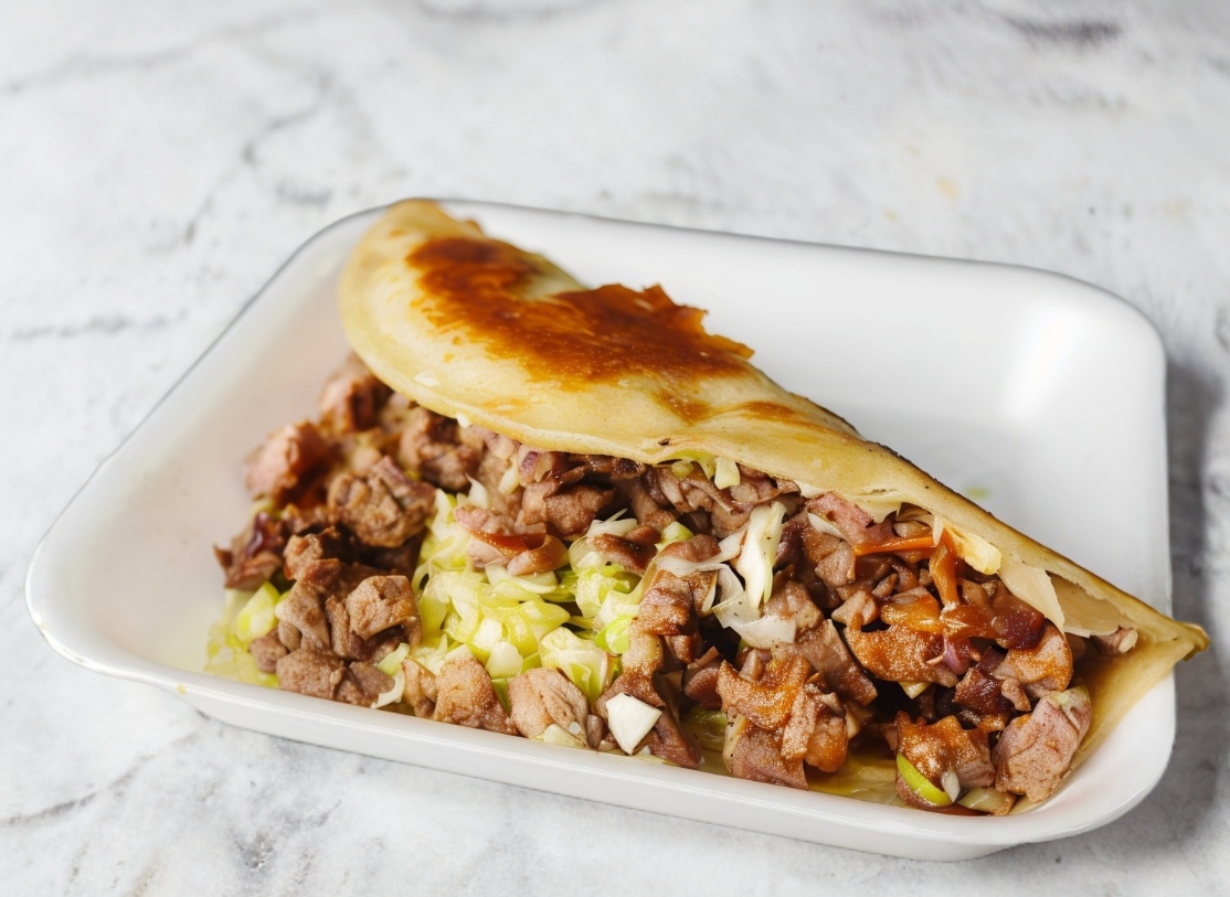 Carne, mantequilla, papa y queso mas tocino, tortilla a escoger entre harina, maíz o dorada.