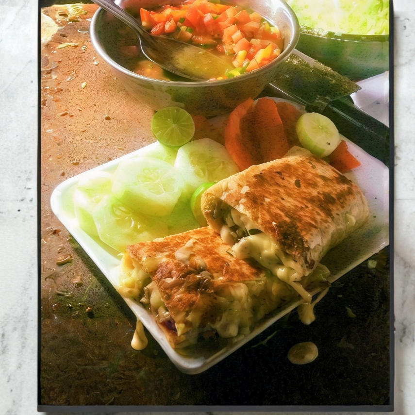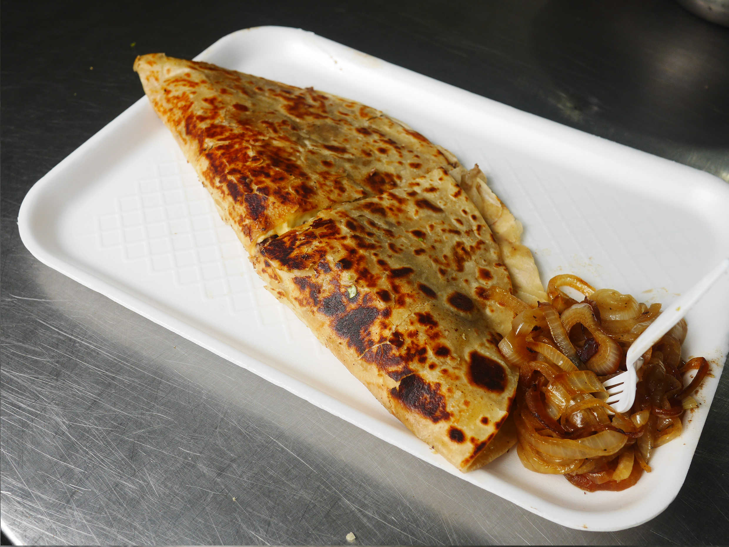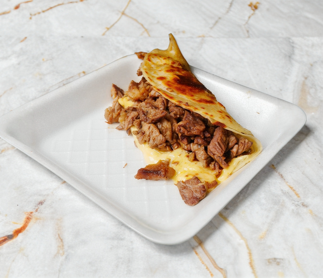 Quesadilla tipo sandwich con doble tortilla tamaño casero, rellena de queso y carne