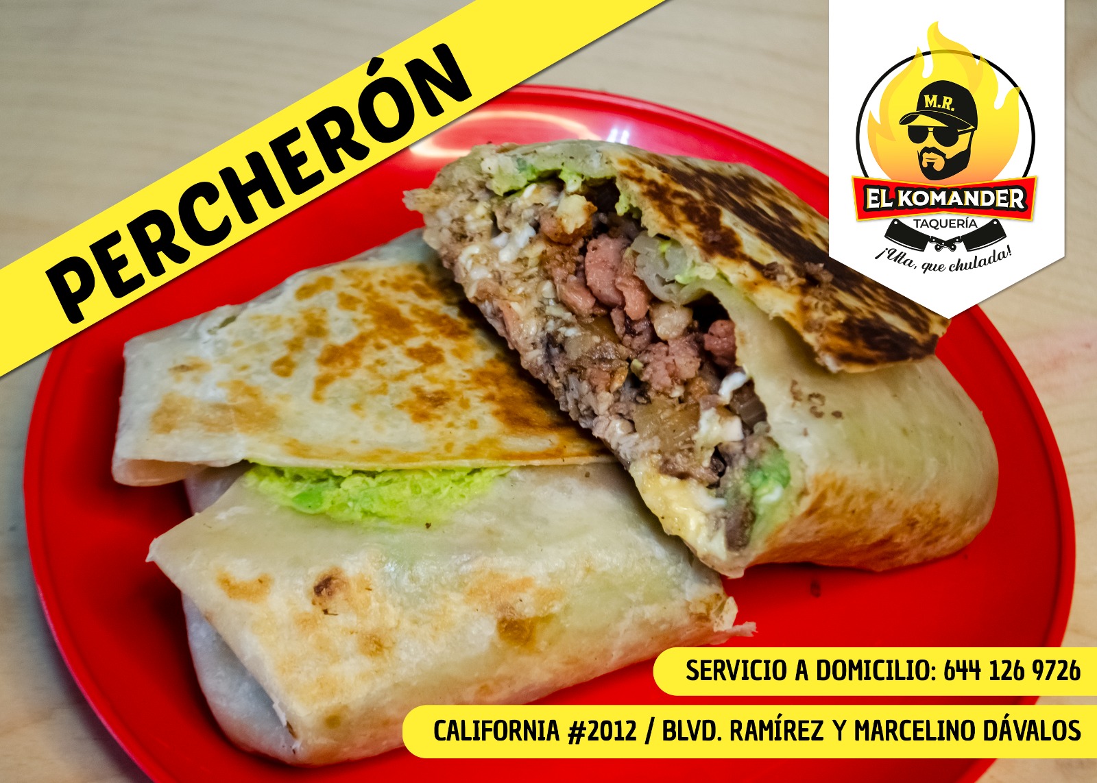 Tortilla de harina JUMBO (17 cms aprox.) con carne asada, queso gratinado, tocino, cebolla asada, aguacate, verdura y jugo de tomate