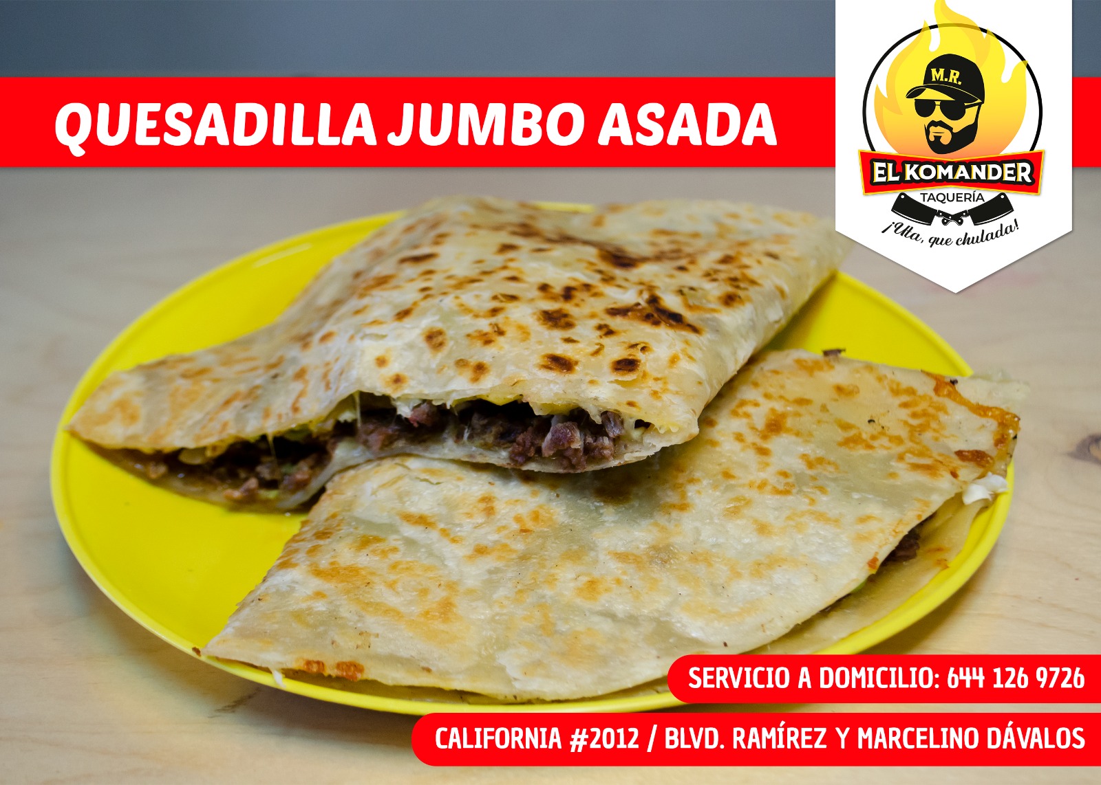 1 quesadilla con tortilla de harina jumbo (17 cm aprox., partida a la mitad) con queso gratinado, salsa verde y 140 g de carne asada. Pieza personal.