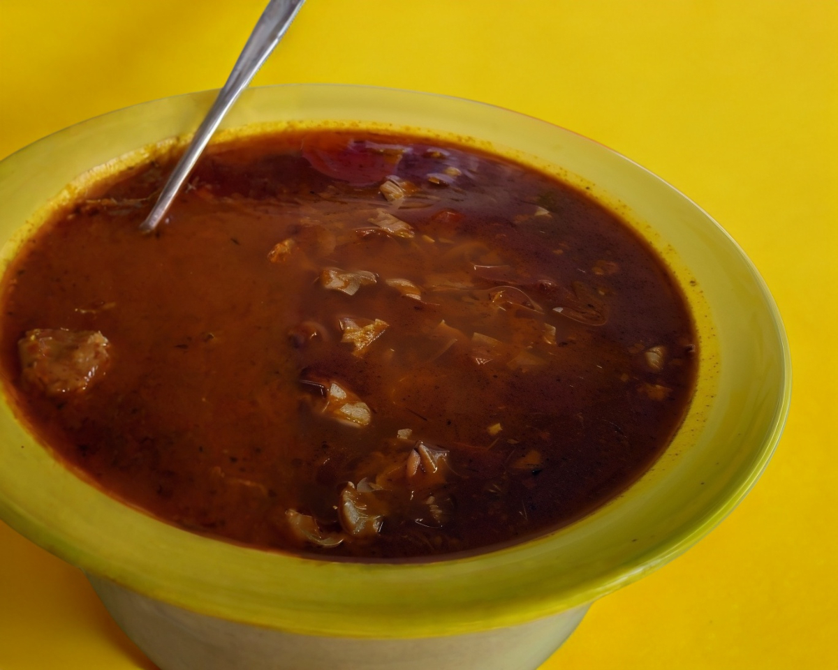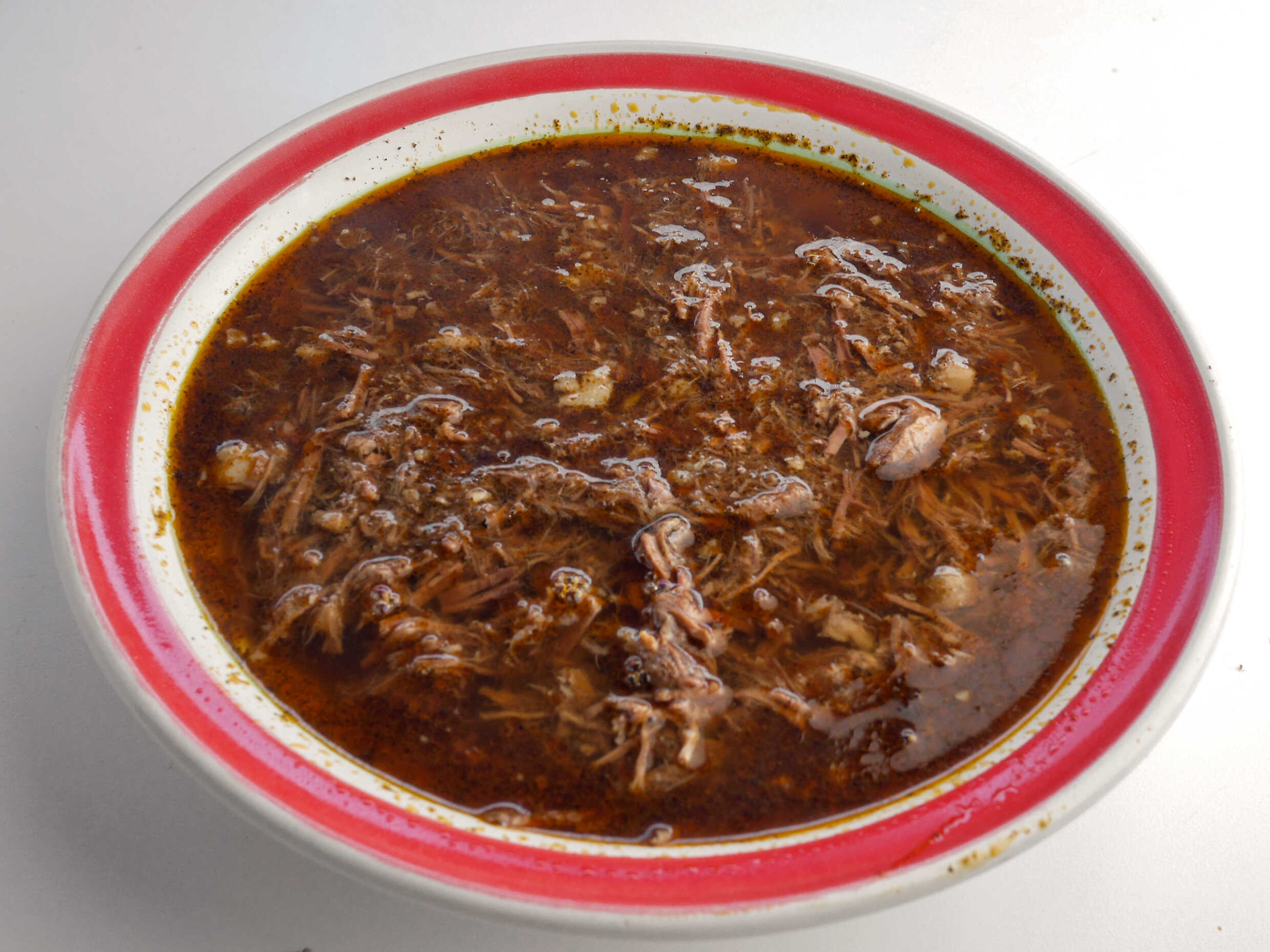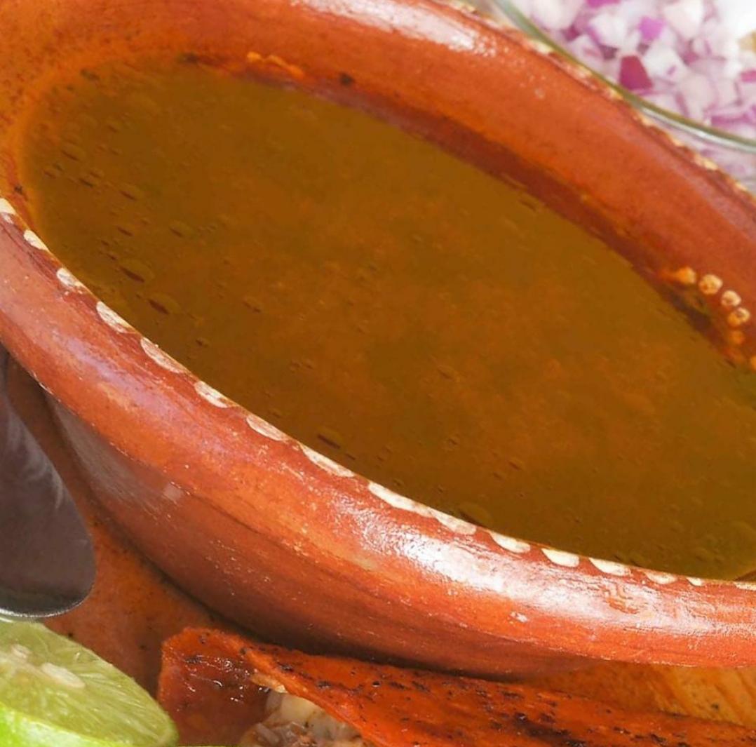 Litro con carne consomé de birria de res con servicio de tortillas verdura.