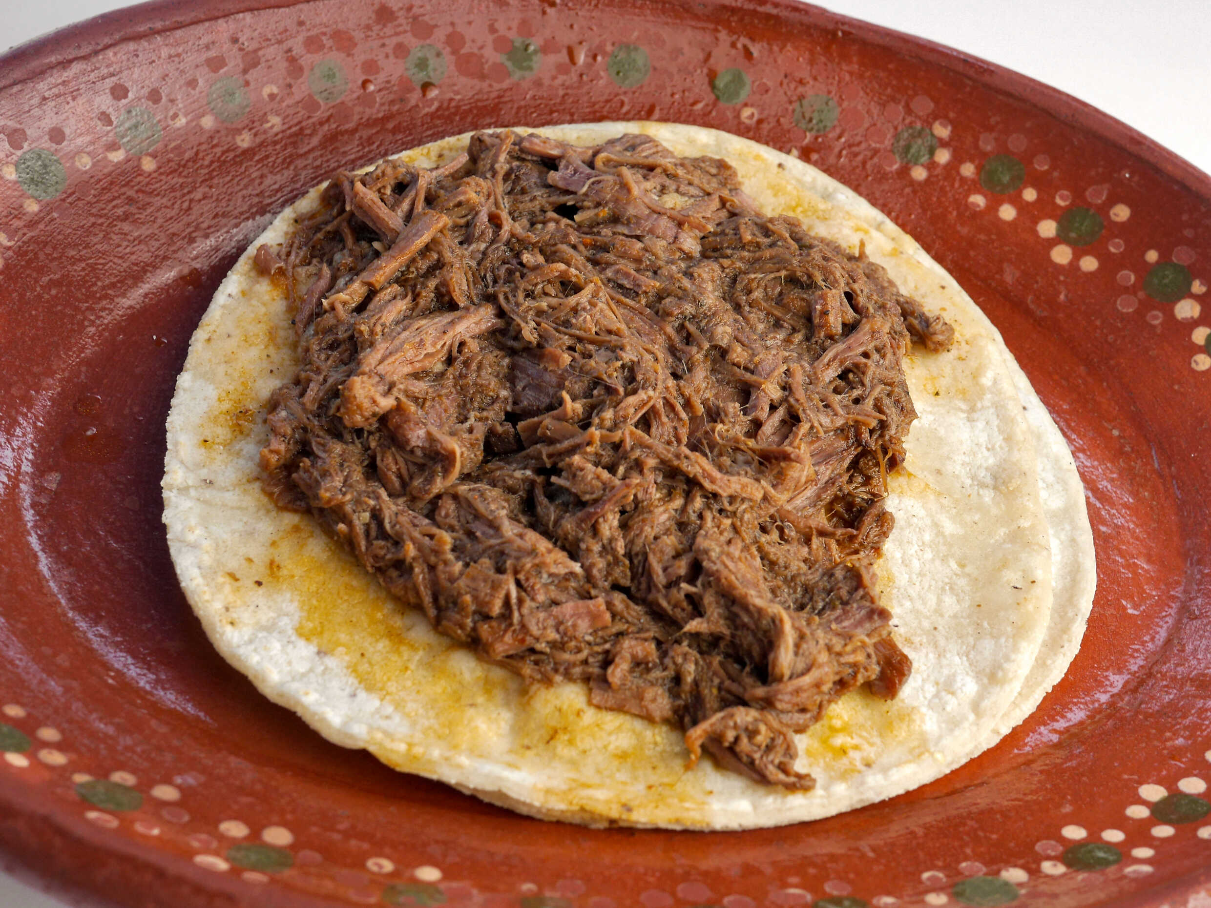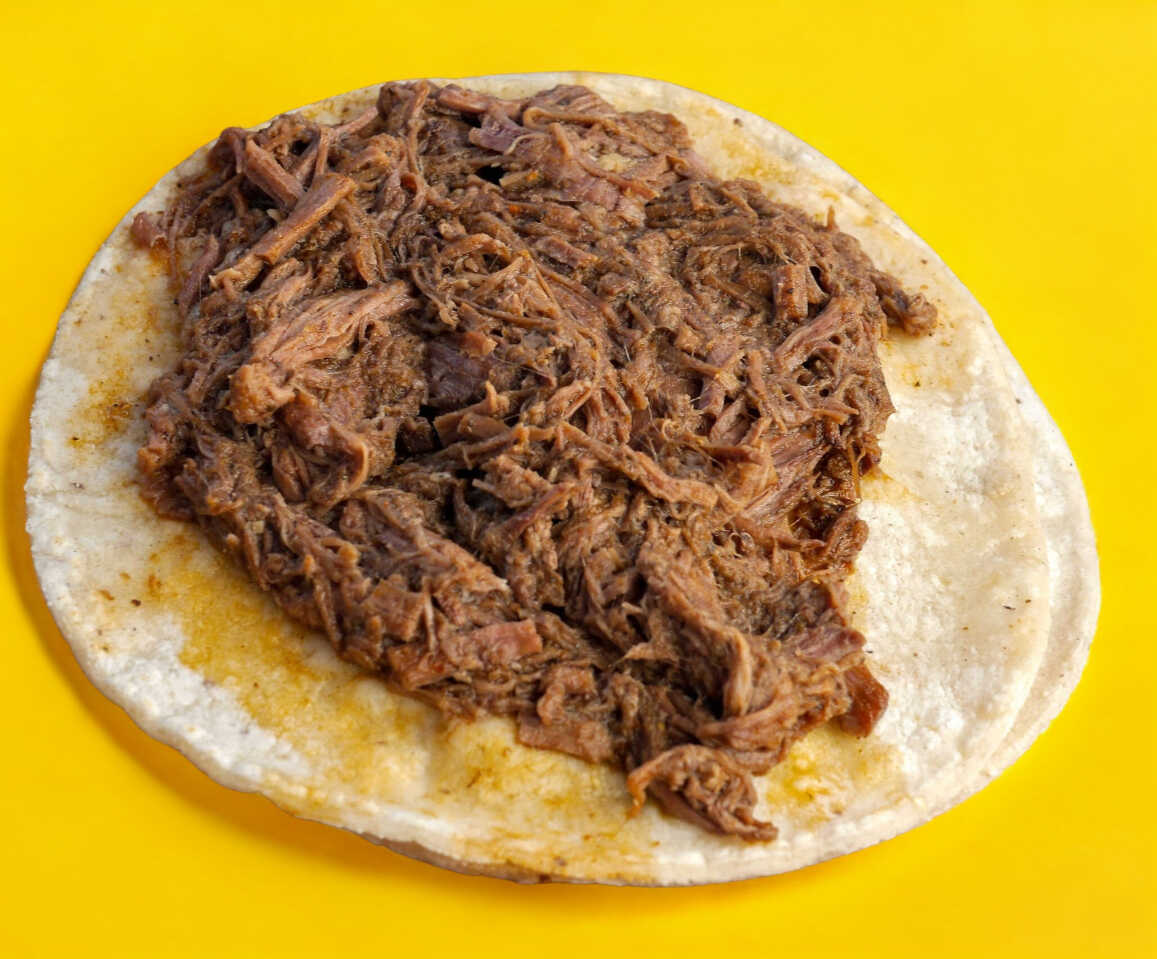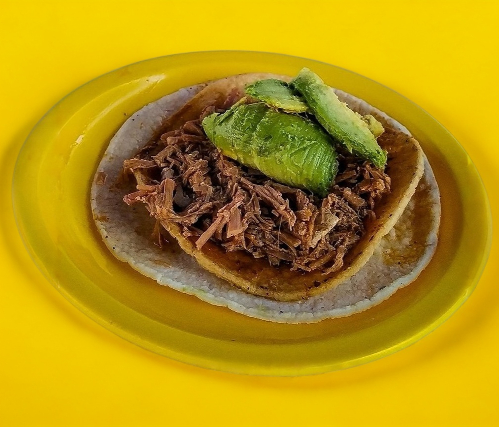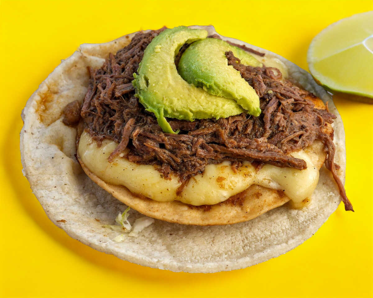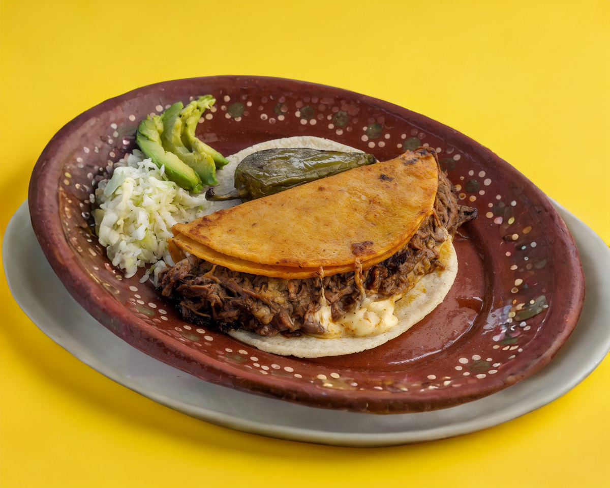 Tortilla de maíz dorada con queso ahogada en jugo de birria con el ingrediente de tu elección.