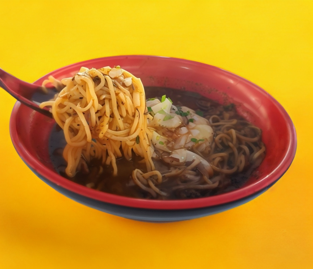 Vaso ½ litro con pasta ramen en caldo y el guiso de su elección.
