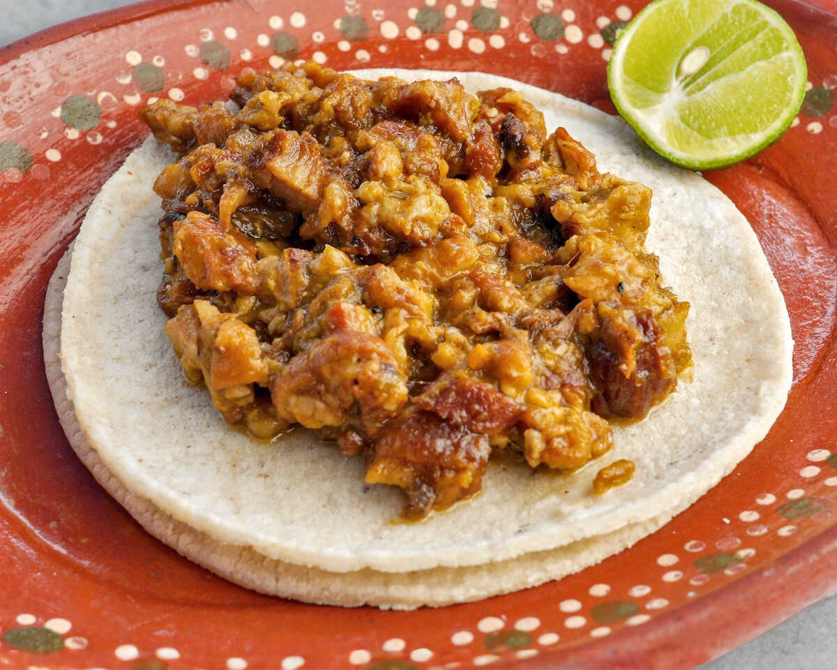 Tortilla de maíz con chicharrón bañado en salsa verde.