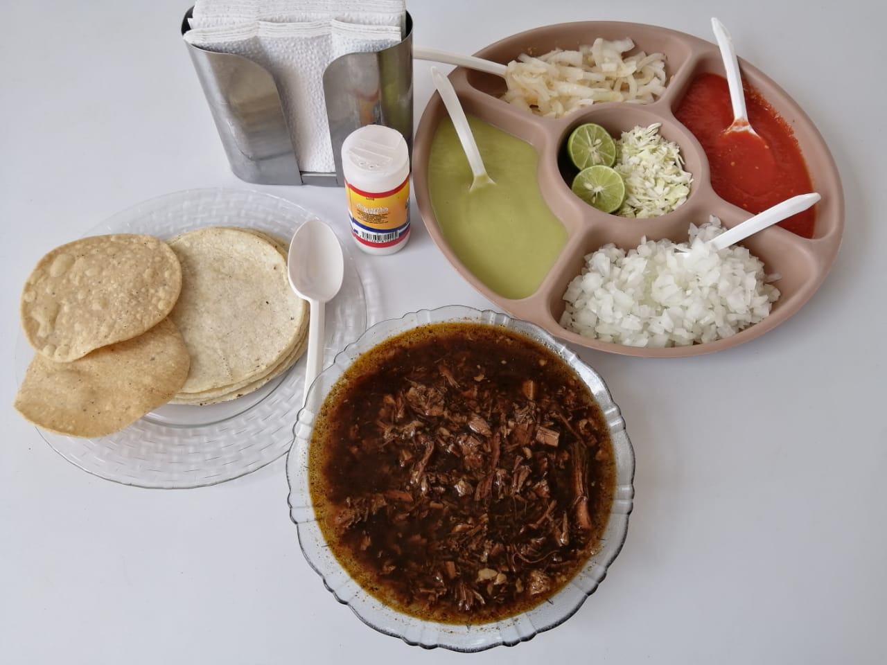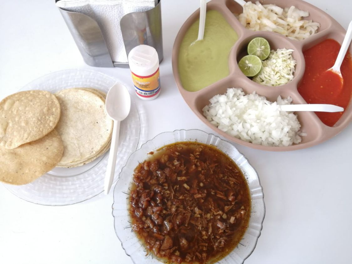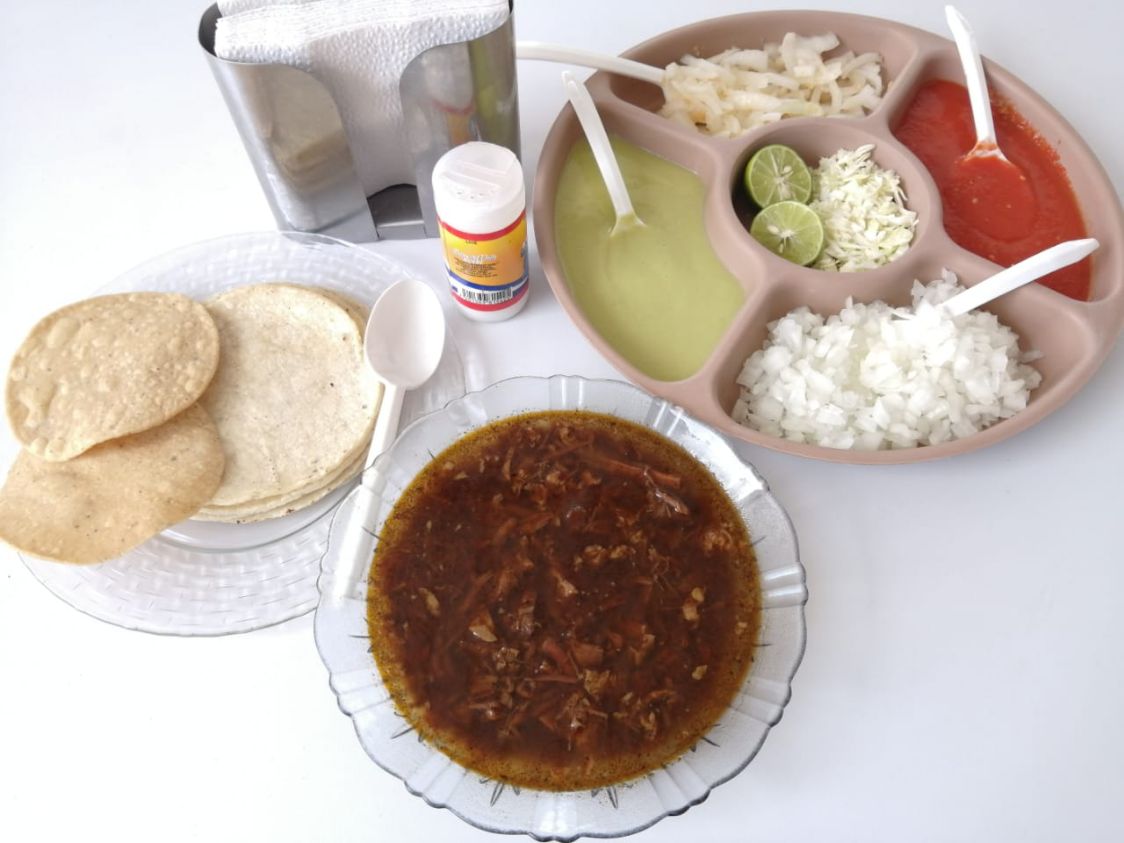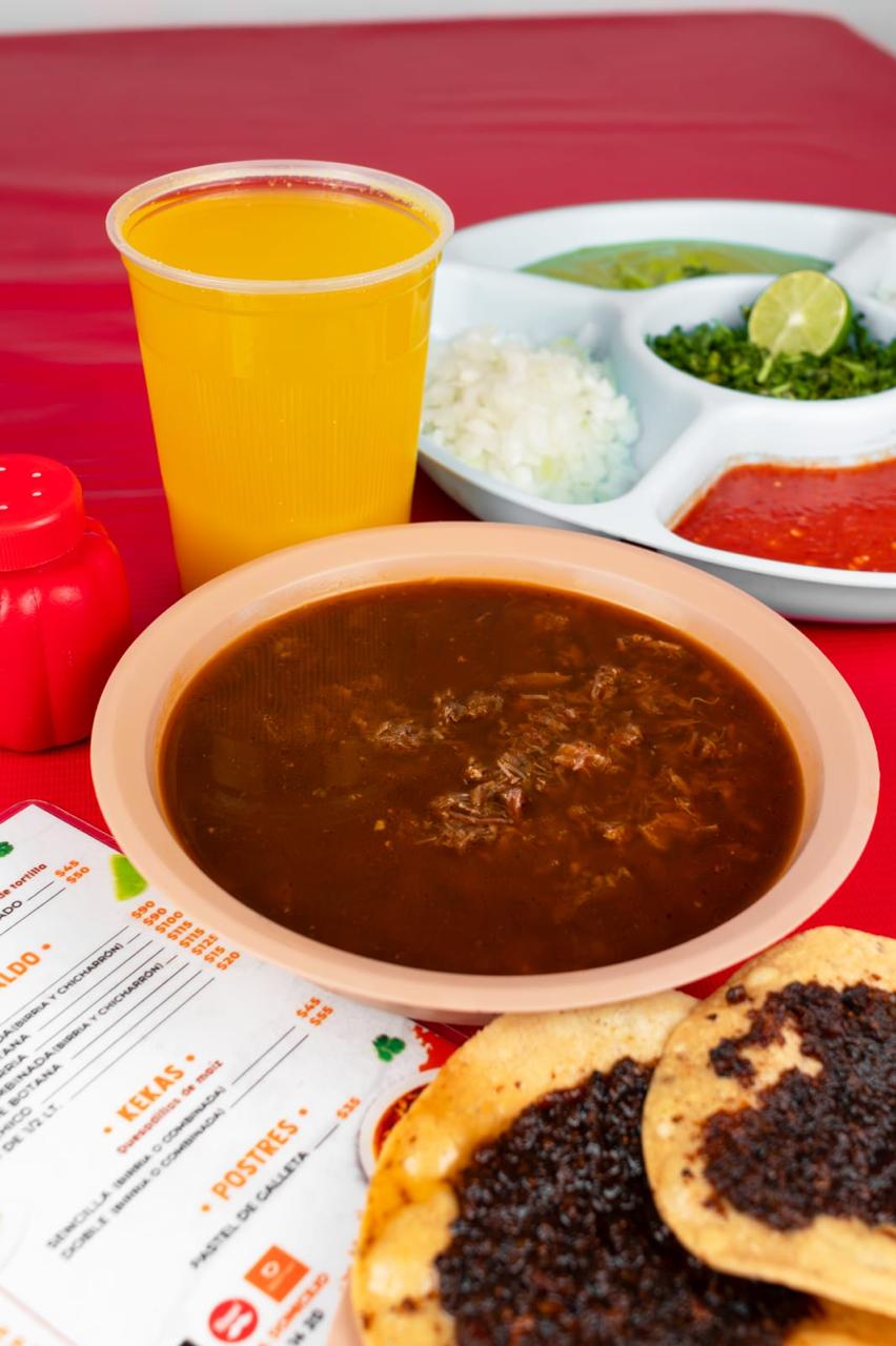 Birria de res en caldo que equivale a 3 tacos, con repollo. Incluye salsa roja, aguacate, cebolla natural y cebolla curtida con habanero