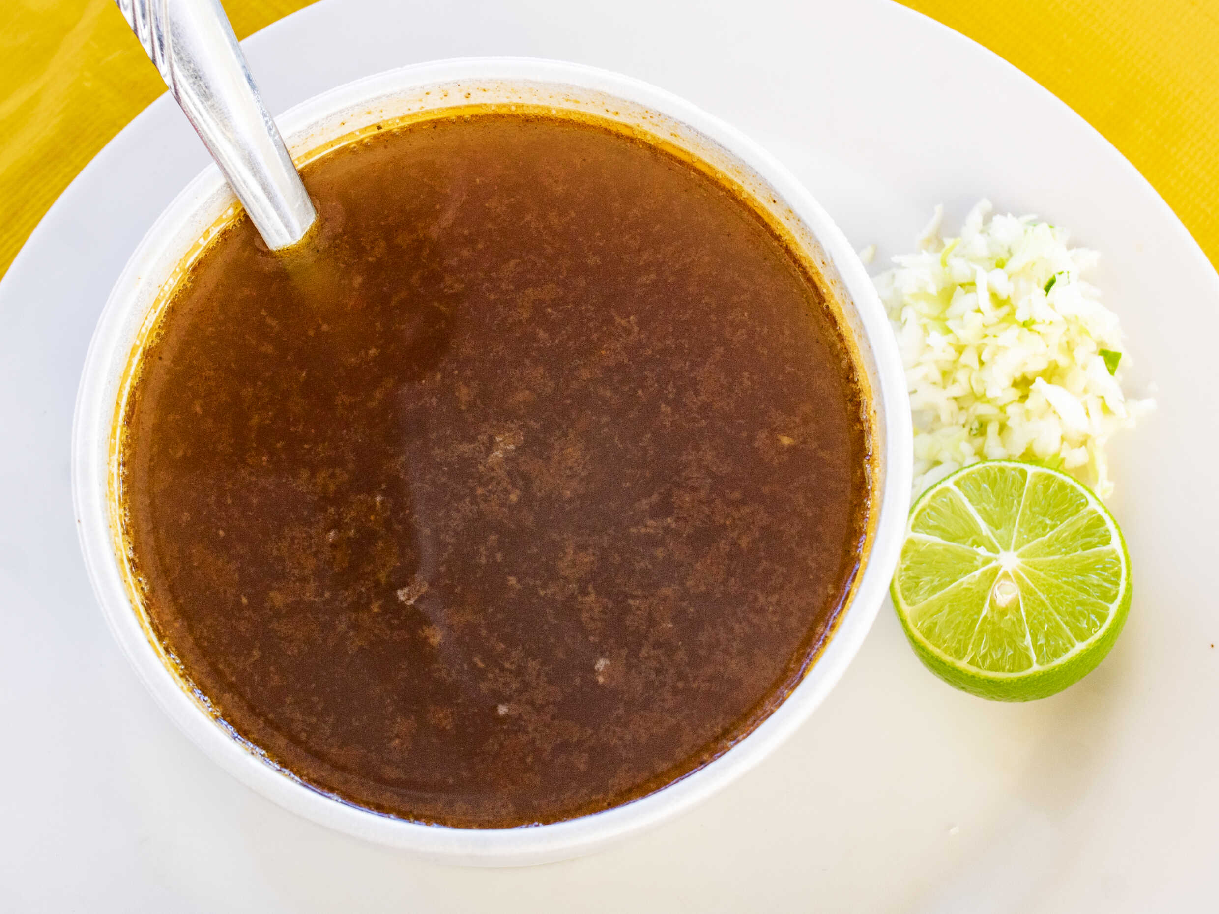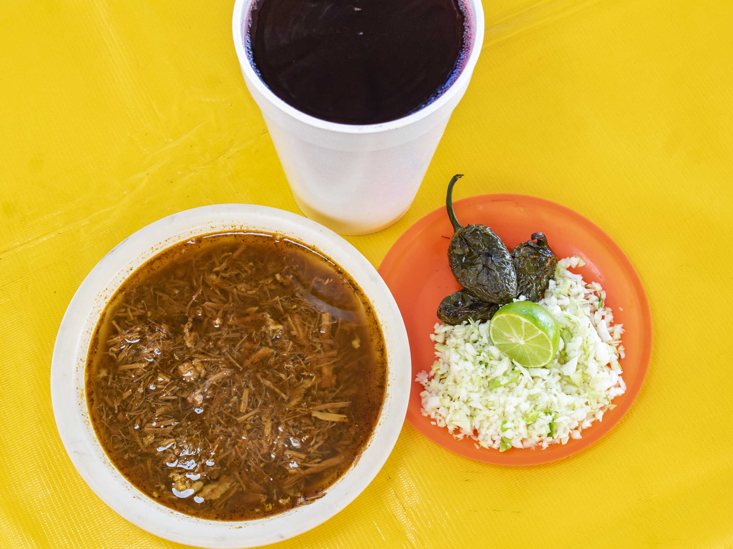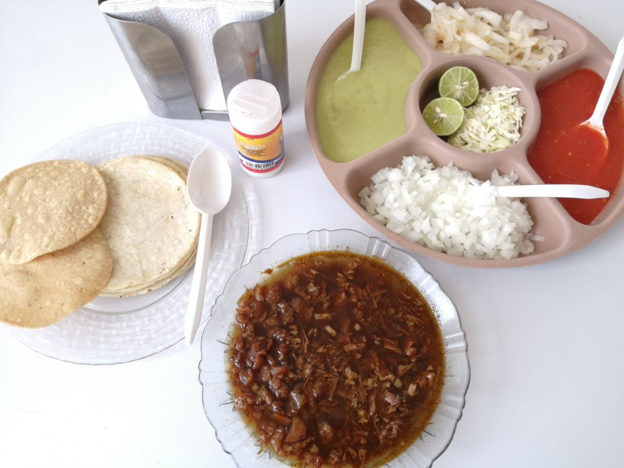 Birria de res en caldo que equivale a 3 tacos, con repollo. Incluye salsa roja, aguacate, cebolla natural y cebolla curtida con habanero
