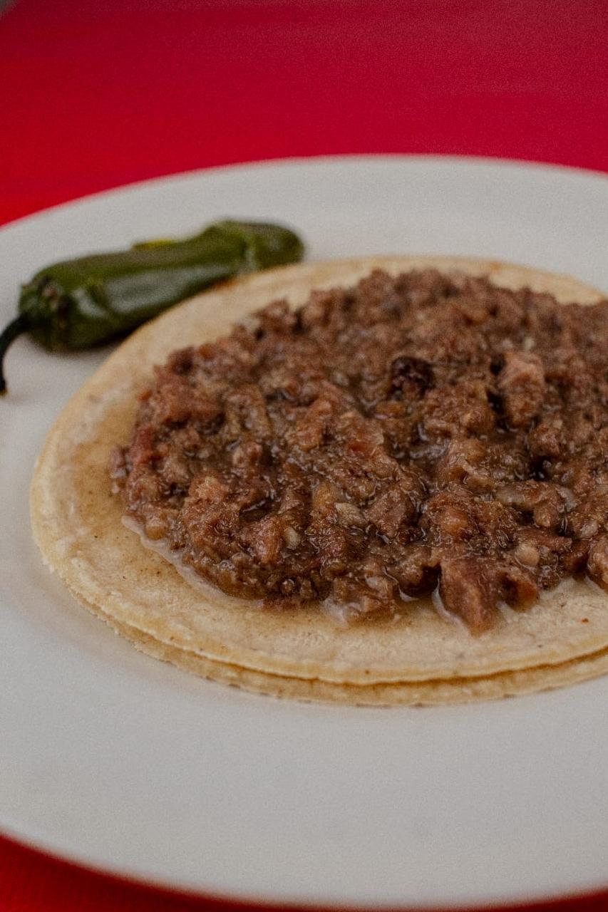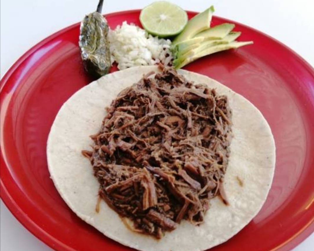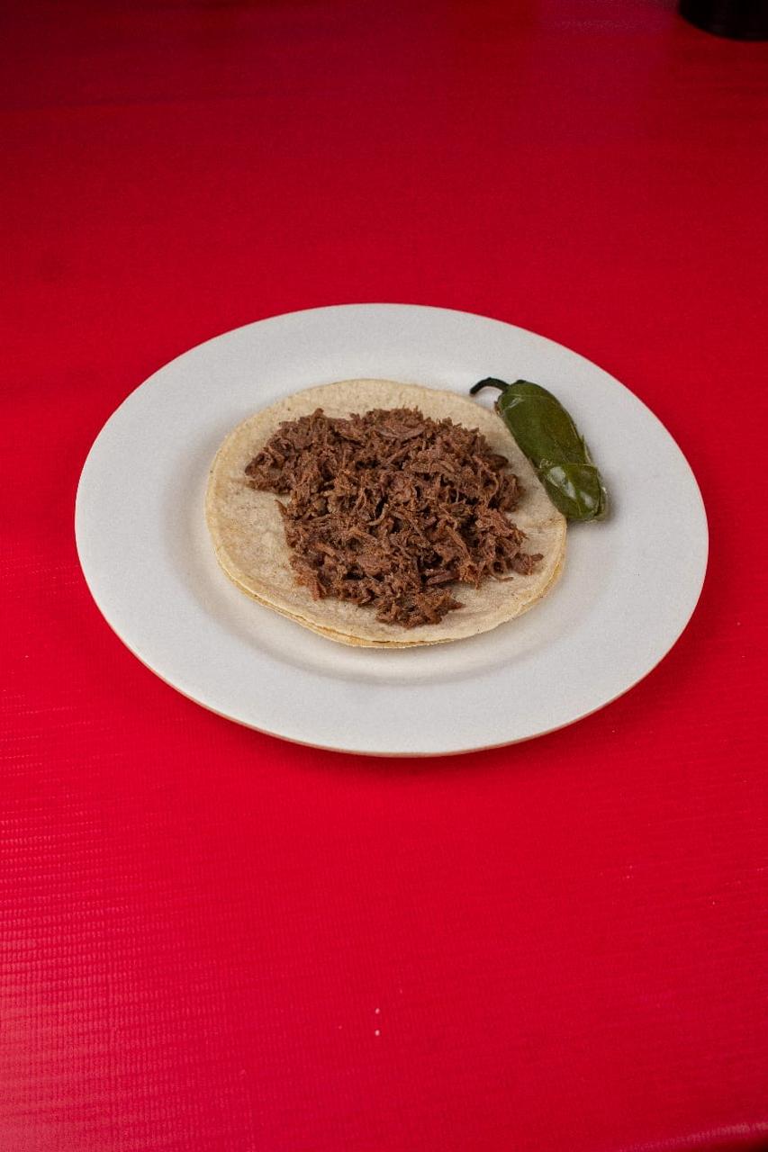 Tortilla de maiz blandita con birria de res, con repollo. Incluye salsa roja, aguacate, cebolla natural y cebolla curtida con habanero
