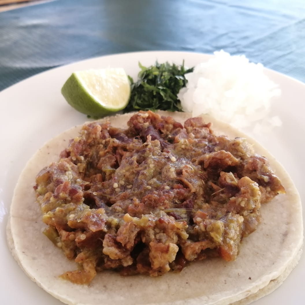 Tortilla de maíz blandita con chicharrón en salsa verde acompañado de cilantro,cebolla natural, limón y salsas
