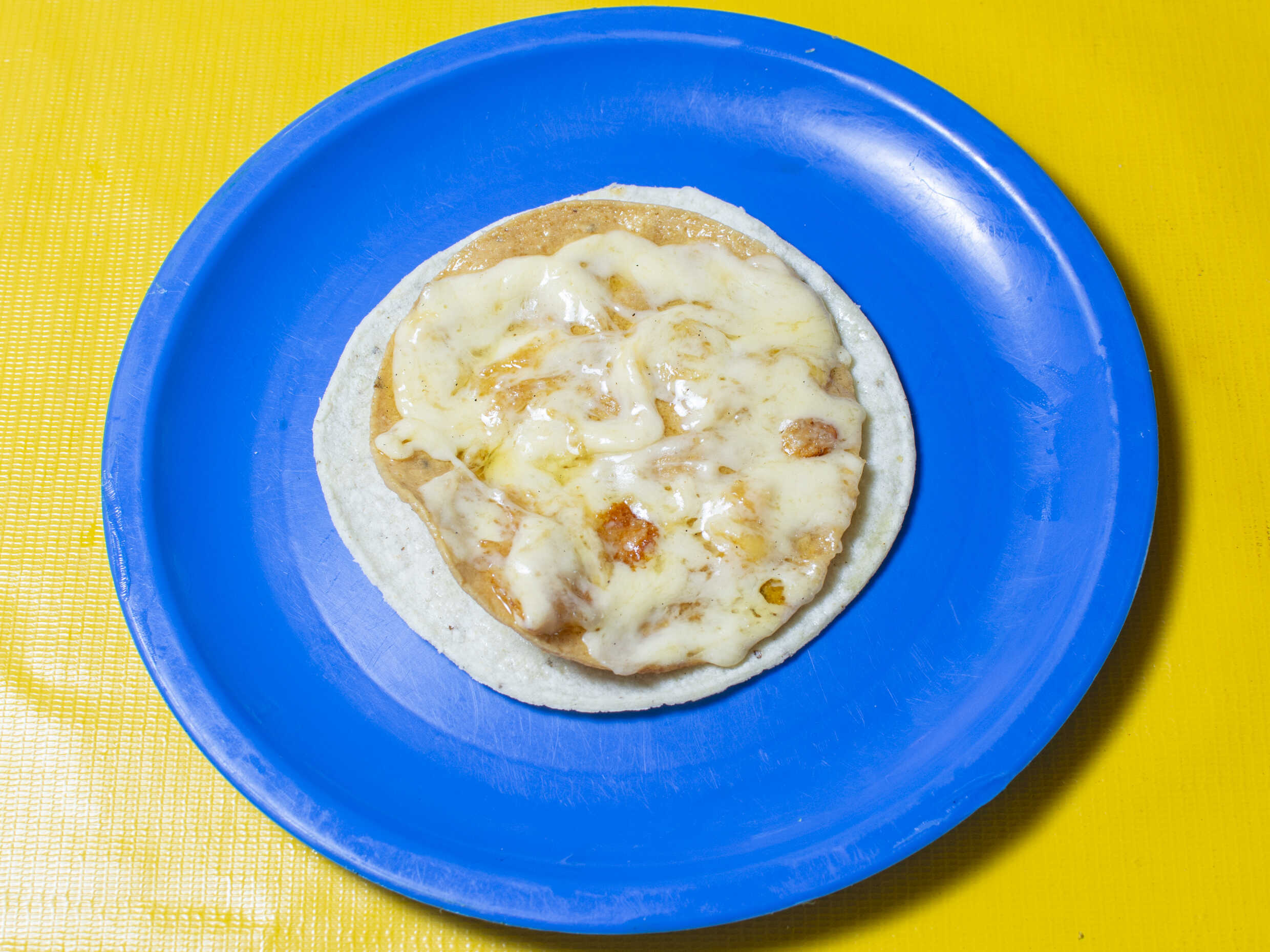 Tortilla de harina chica (del tamaño de una tortilla de maíz) con queso gratinado y birria de res