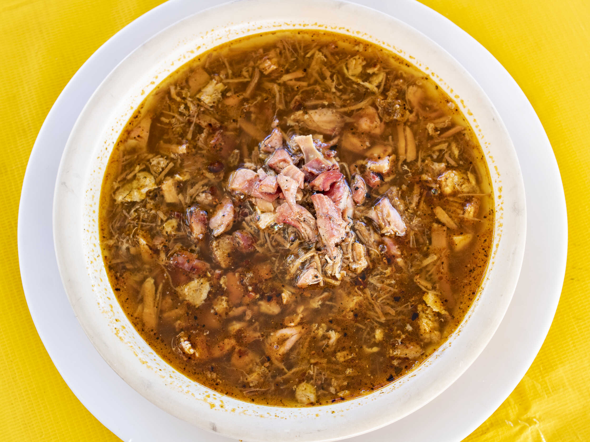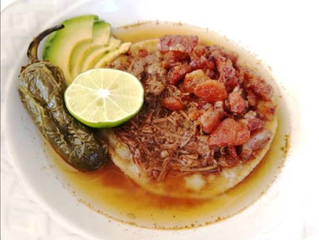 Tortilla de maiz dorada con birria de res y chicharrón, con repollo, ahogado en caldo de res. Incluye salsa roja, aguacate, cebolla natural y cebolla curtida con habanero