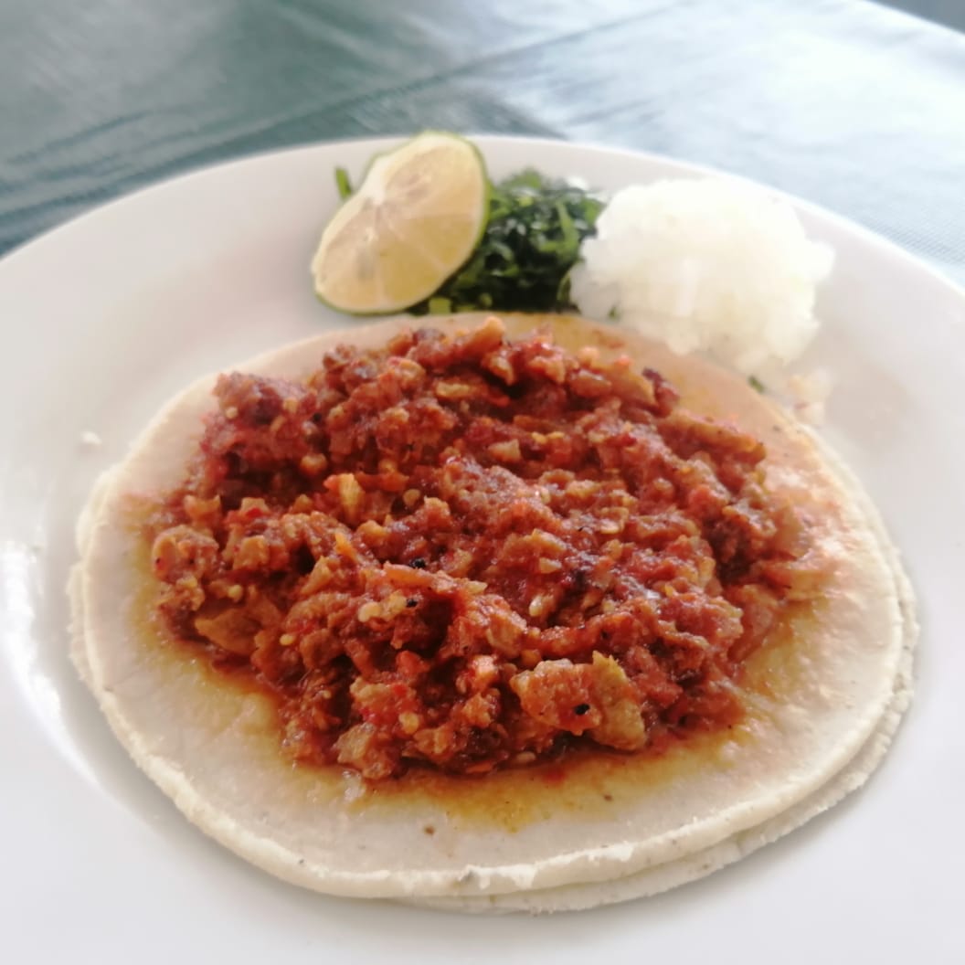 Tortilla de maíz blandita con chicharrón en salsa roja acompañado de cilantro,cebolla natural, limón y salsas